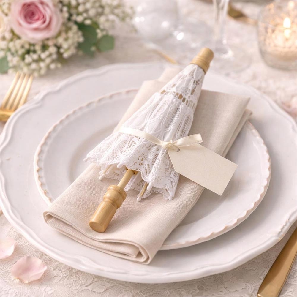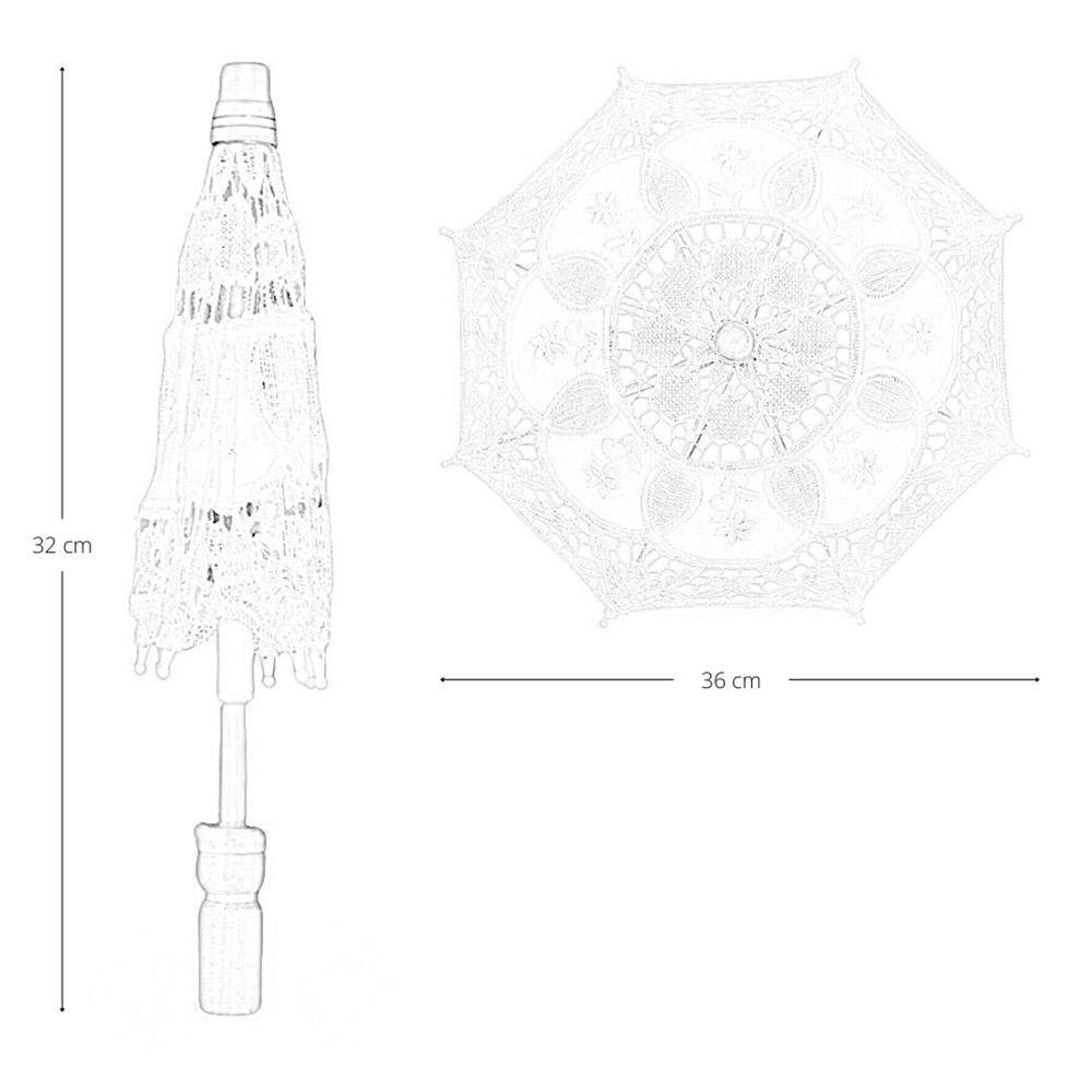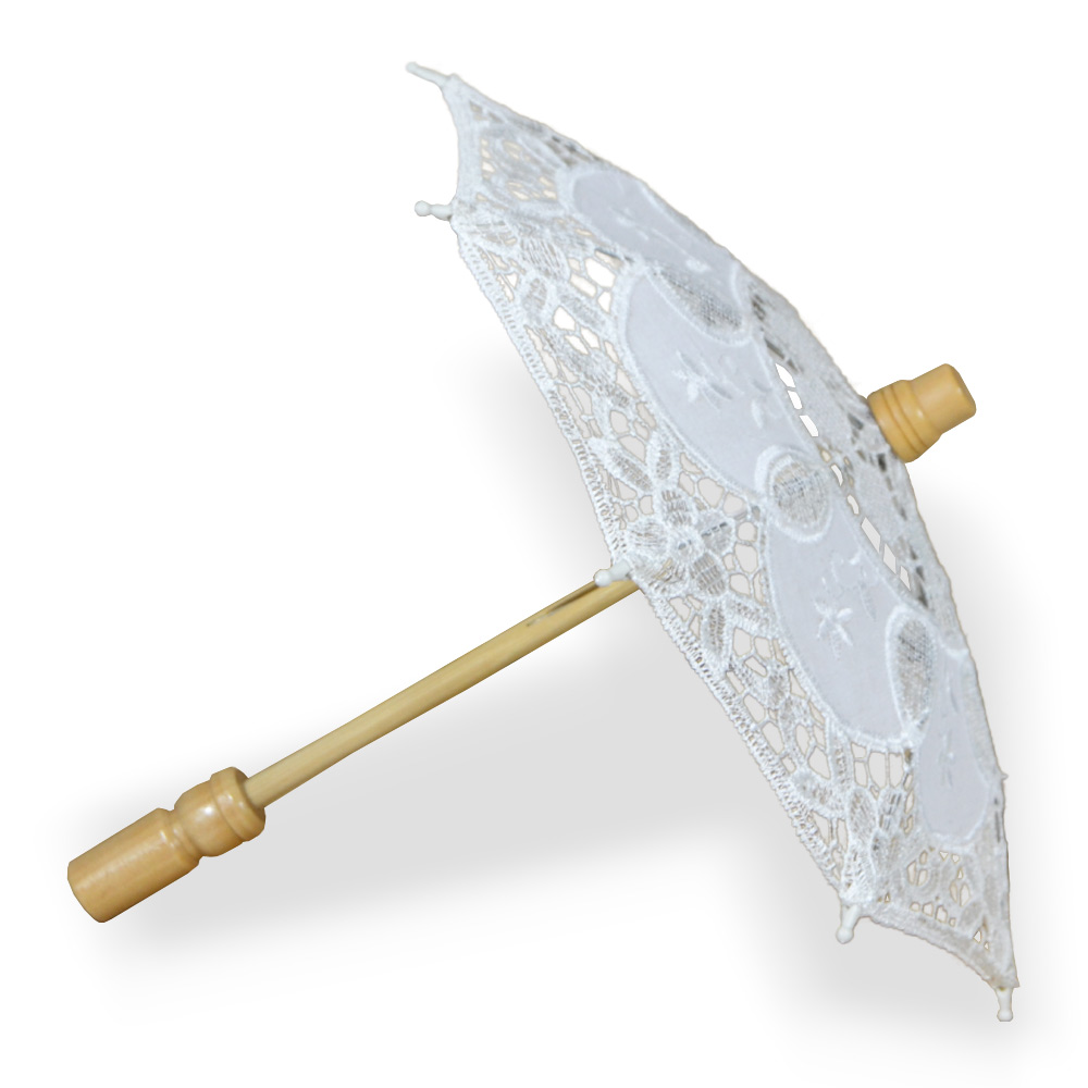 Set da 10 ombrellini Wedding in elegante pizzo bianco ricamato, con raffinata trama decorativa e manico in legno lucidato.