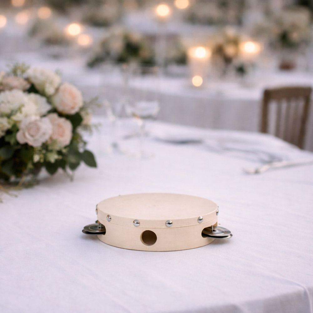 Set da 10 tamburelli in legno con sonagli metallici, ideali per oggetti decorativi per eventi e cerimonie.