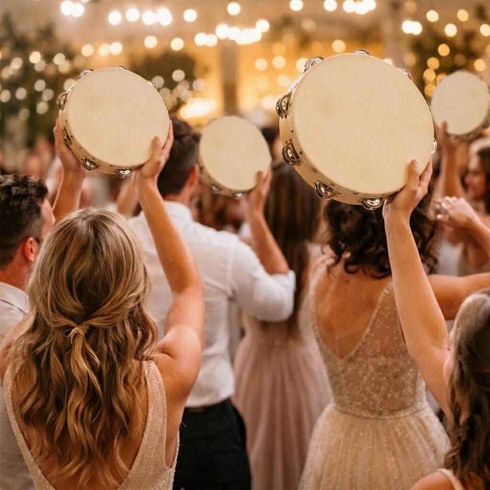 Set da 5 tamburelli in legno con sonagli metallici, ideali per oggetti decorativi per eventi e cerimonie.