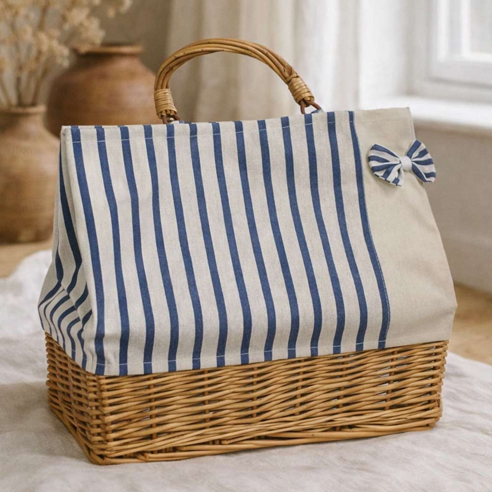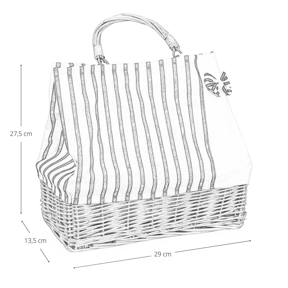La struttura unisce la solidità del vimini naturale alla leggerezza del tessuto, creando un mix pratico ed elegante. Il manico rigido garantisce una presa comoda e resistente, ideale per l’utilizzo quotidiano.