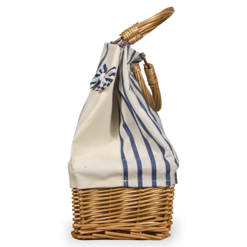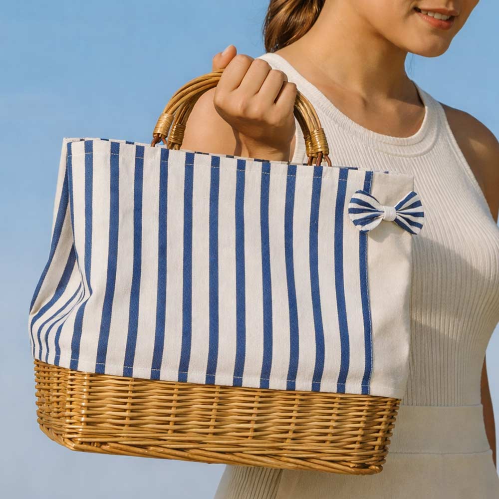 Borsa mare modello Spring con manico e base a cesta in vimini intrecciato e parte superiore in tela blu a righe.