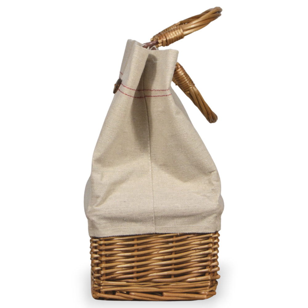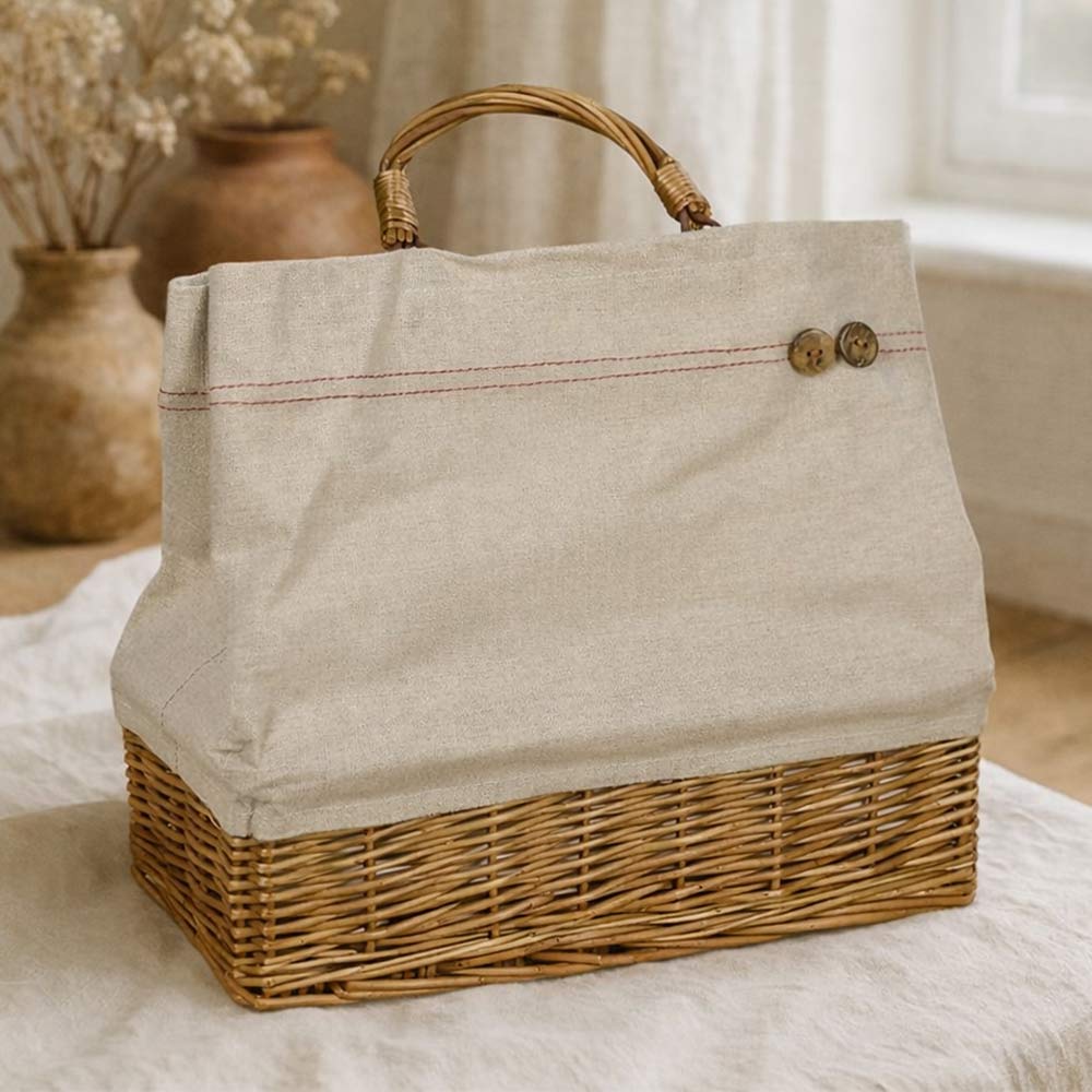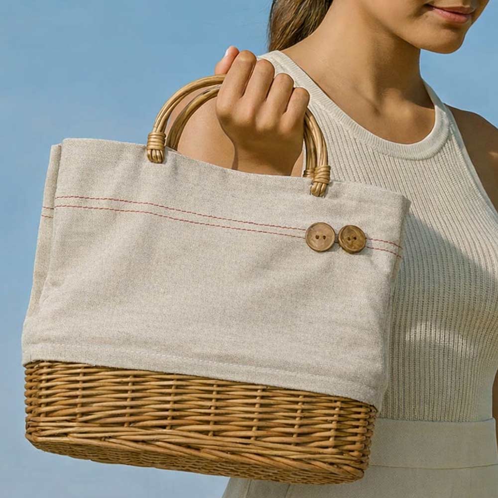La struttura unisce la solidità del vimini naturale alla leggerezza del tessuto, creando un mix pratico ed elegante. Il manico rigido garantisce una presa comoda e resistente, ideale per l’utilizzo quotidiano.