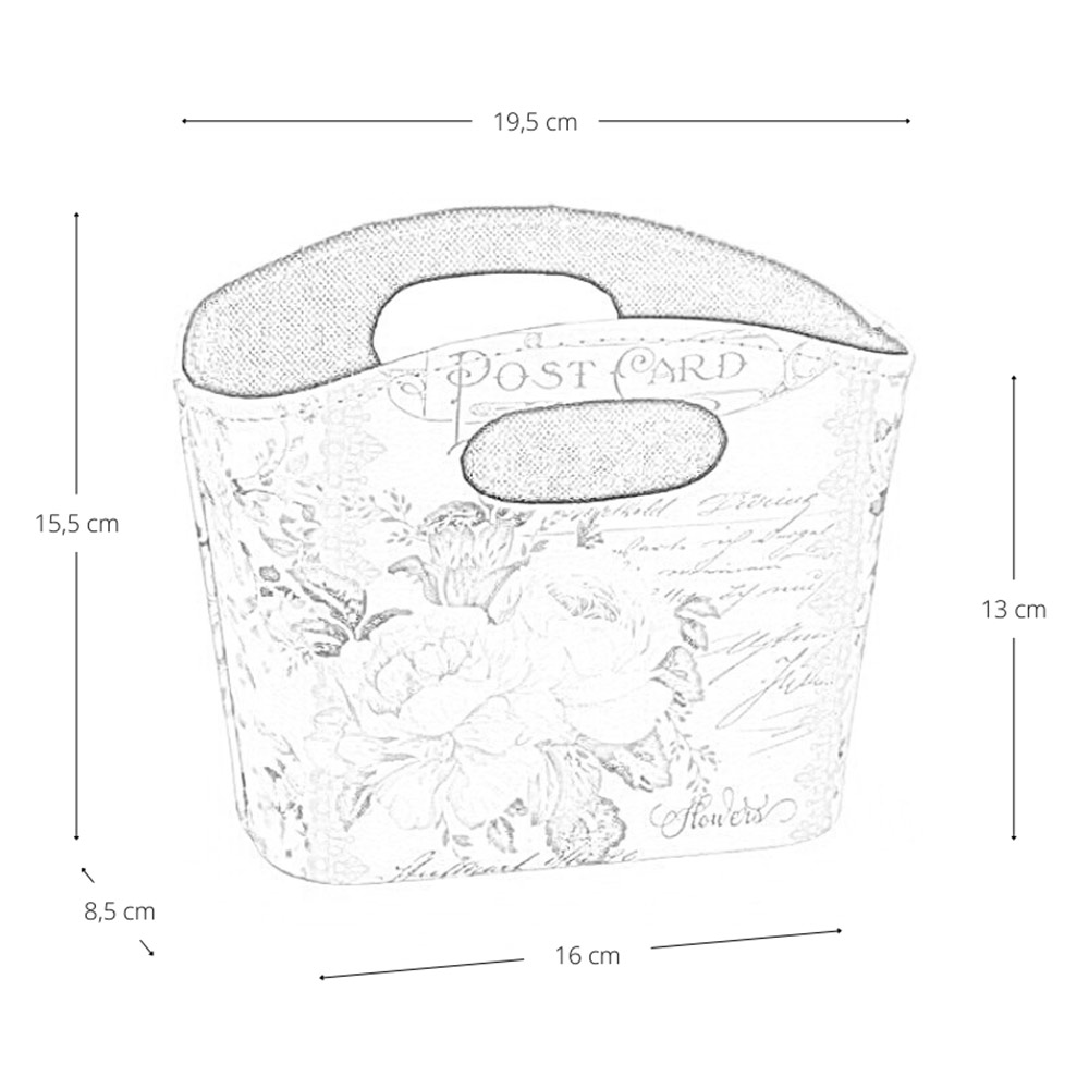 Dimensioni del prodotto: larghezza superiore 19,5 cm, larghezza inferiore 16 cm, profondità 8,5 cm, altezza 15,5 cm.