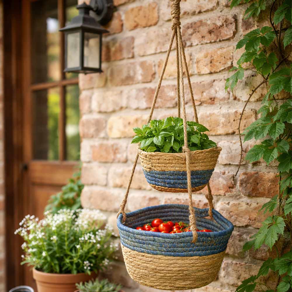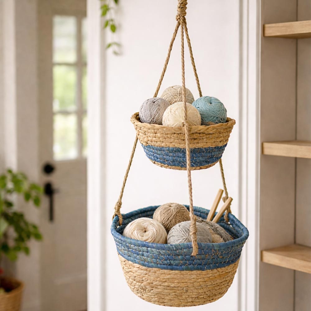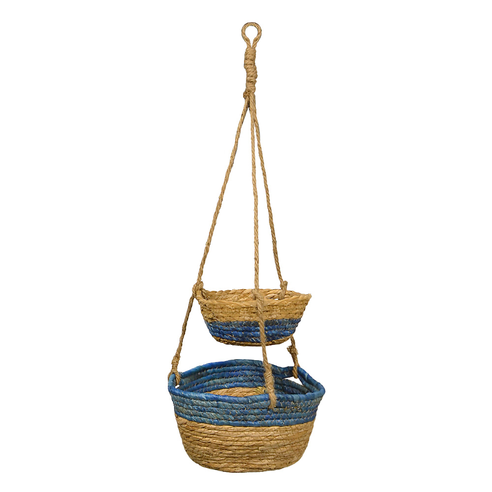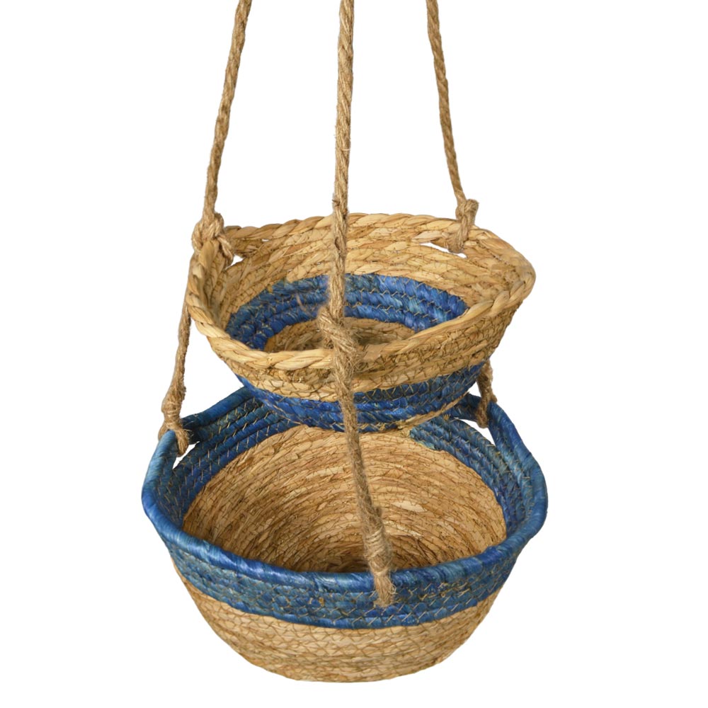 Vaso pensile decorativo a due livelli realizzato in corda intrecciata nei toni naturali del beige con elegante dettaglio blu, perfetto per esporre piante e creare composizioni sospese dallo stile fresco e moderno.