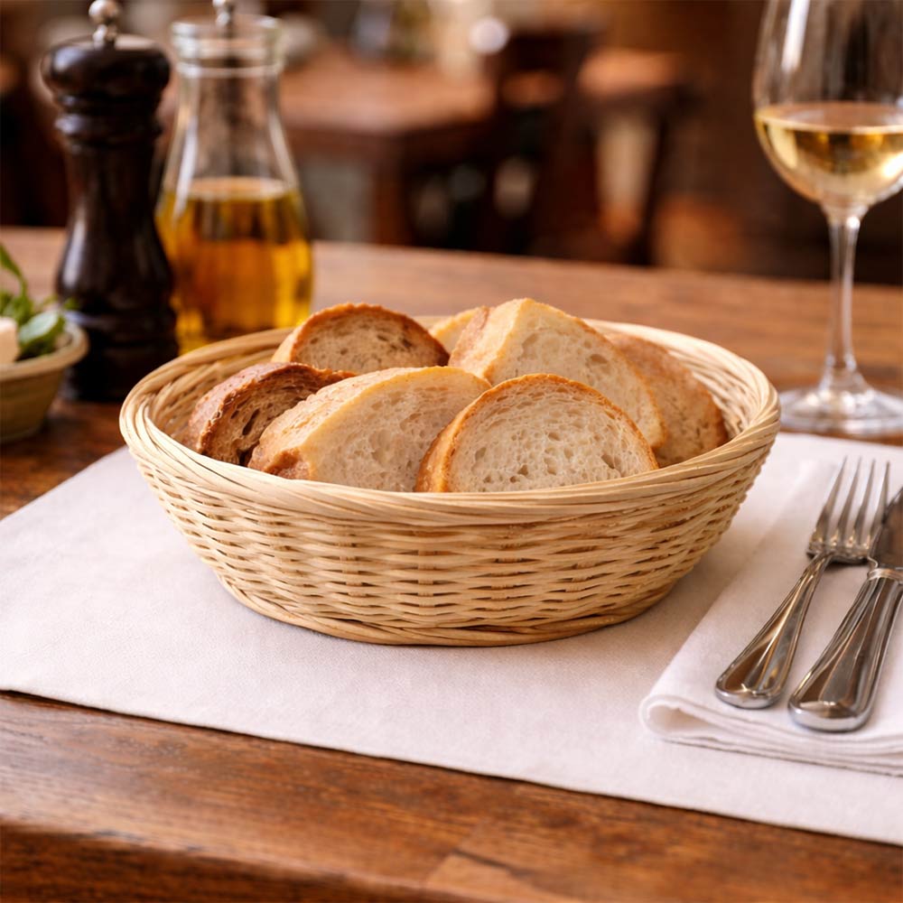 La particolare forma rotonda a nido, con bordi sagomati e struttura compatta, li rende perfetti sia come espositori sia come contenitori decorativi. Ideali per pane, bomboniere, confezioni regalo, prodotti artigianali o piccoli oggetti.