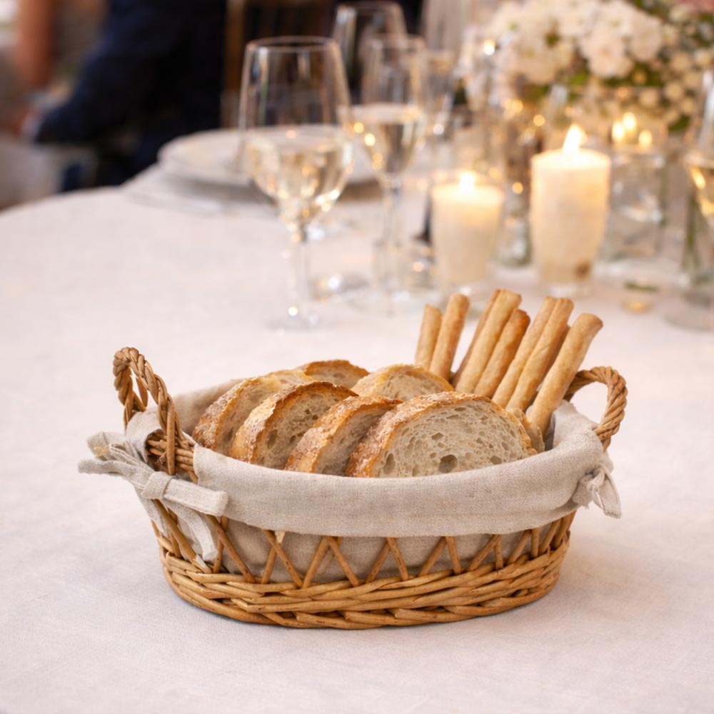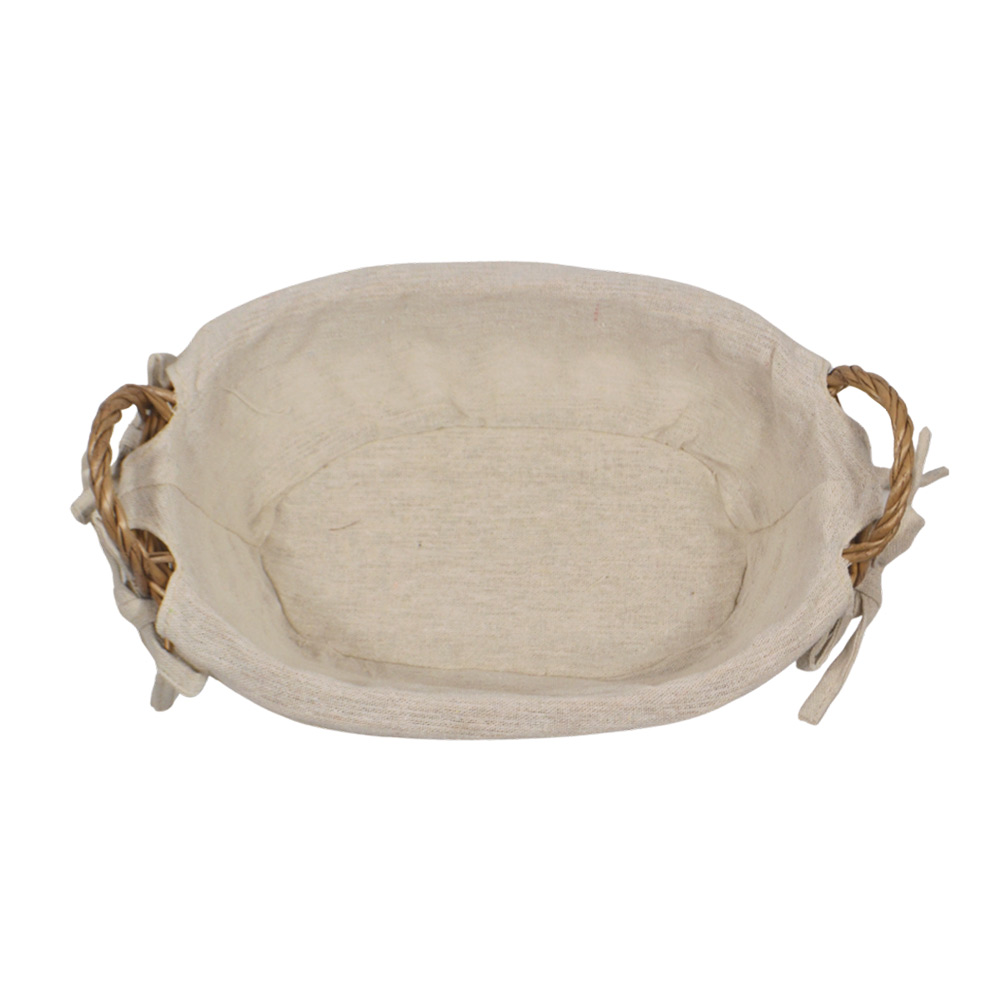 Design tradizionale: cestini ovali portapane x10 in vimini intrecciato a mano di colore avorio, con manici intrecciati e fodera interna in juta naturale.