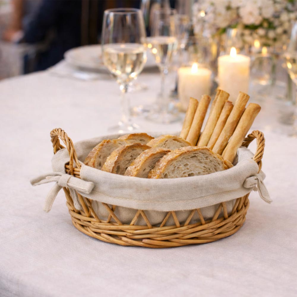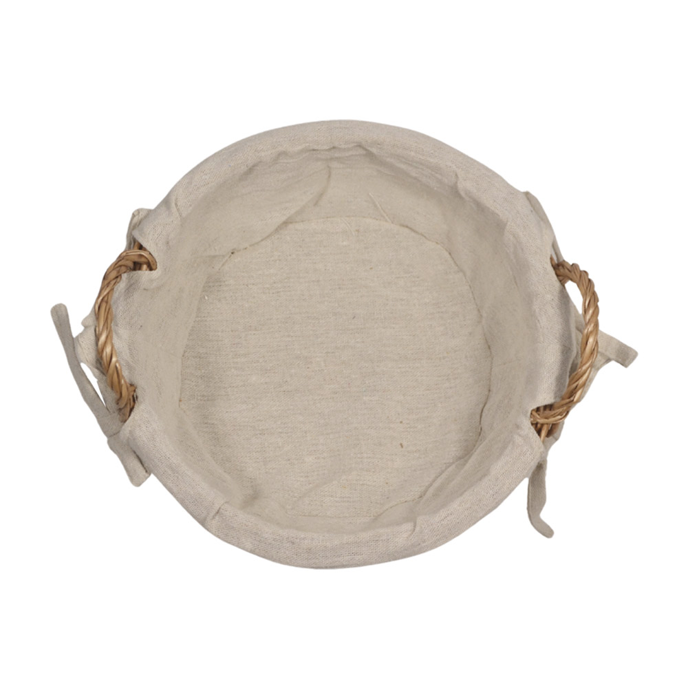 Design tradizionale: cestini tondo portapane x10 in vimini intrecciato a mano di colore avorio, con manici intrecciati e fodera interna in juta naturale.