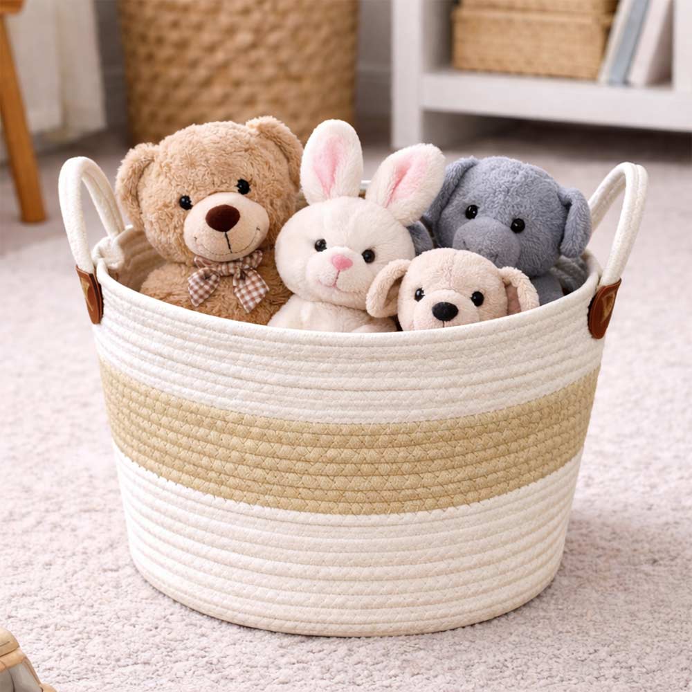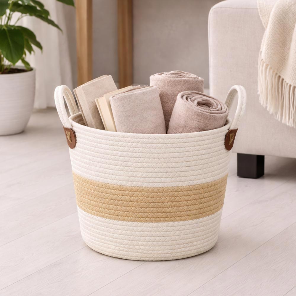 La struttura morbida ma solida garantisce stabilità e grande capacità contenitiva, mentre le maniglie integrate permettono di spostare i cesti con facilità in ogni ambiente.