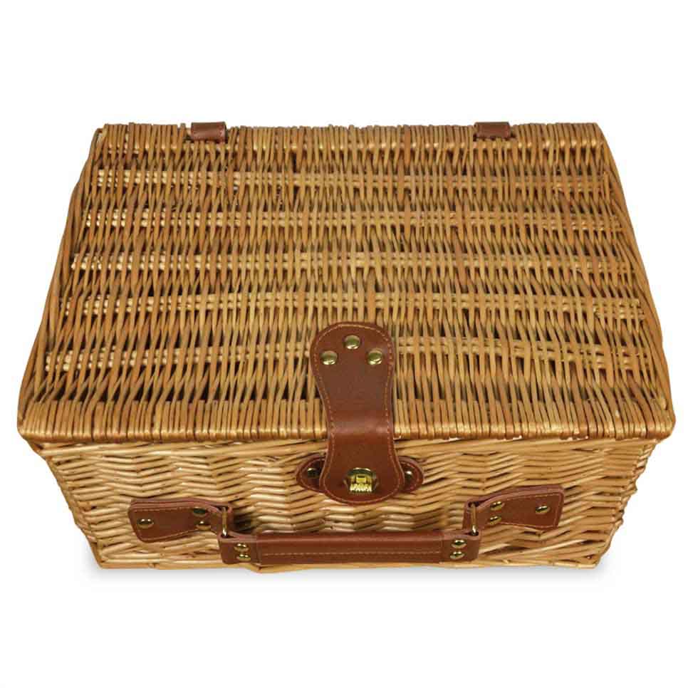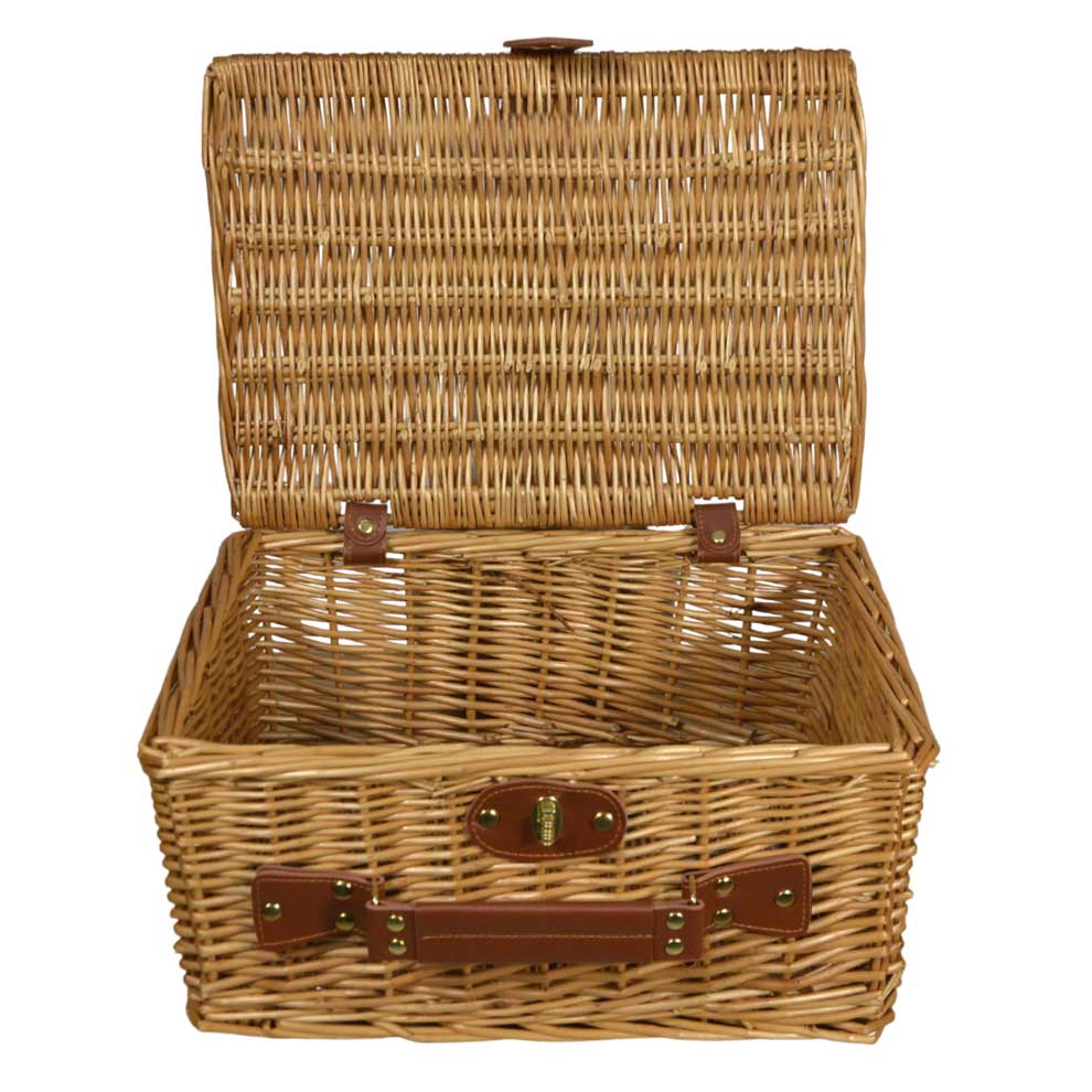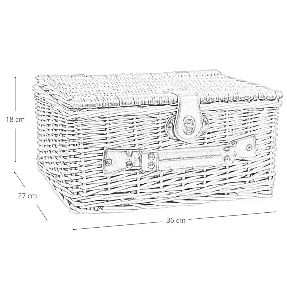 Cesto bauletto rettangolare in vimini naturale con manico e chiusura in metallo.