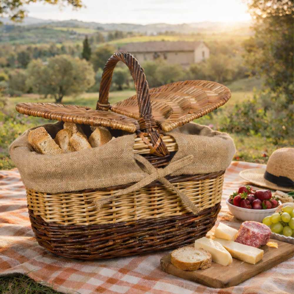 Design artigianale: intrecciato a mano in pregiato vimini bicolore, foderato in juta con finiture curate e doppio coperchio.