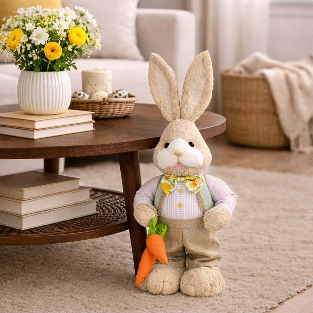 Coniglio decorativo pasquale in stile campagna, perfetto per arricchire la casa con una decorazione primaverile elegante e originale.