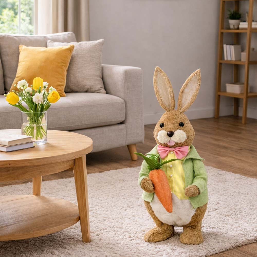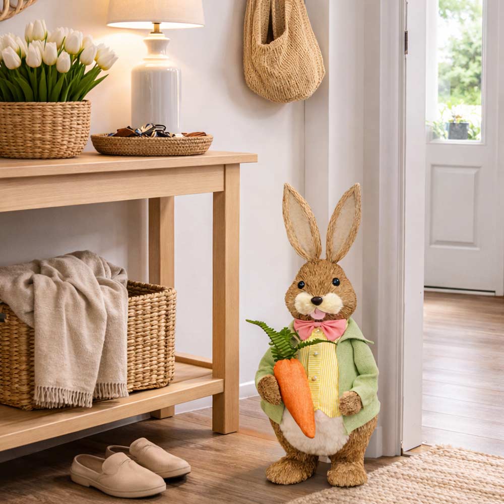 Coniglio decorativo pasquale in stile campagna, perfetto per arricchire la casa con una decorazione primaverile elegante e originale.