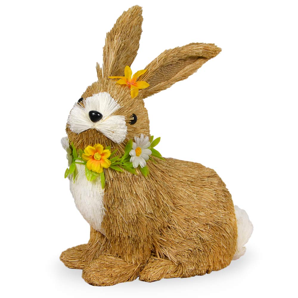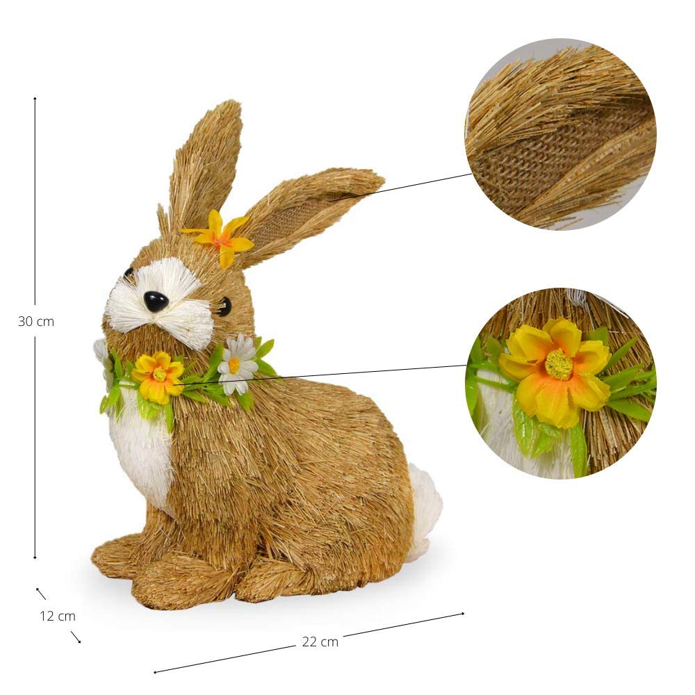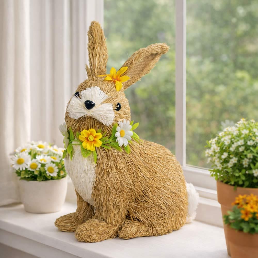 Coniglio pasquale decorativo realizzato in rafia naturale dal colore beige, perfetto per aggiungere un tocco primaverile alla casa.