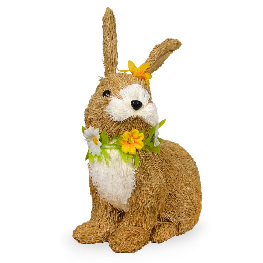 Il coniglietto è impreziosito da una collana di fiori colorati e da un fiore decorativo sulla testa, dettagli che richiamano l’atmosfera della primavera.