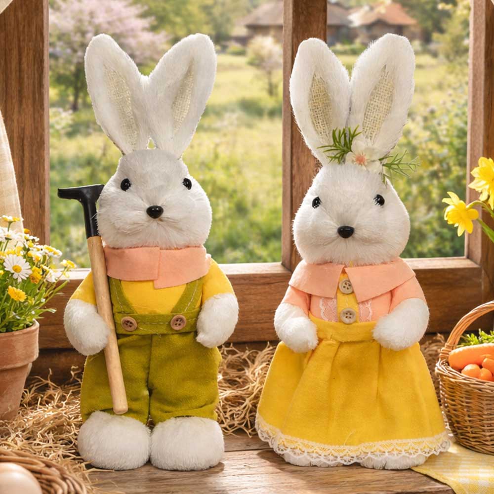 Coppia di coniglietti decorativi in stile campagna, perfetti per arricchire la casa con una decorazione primaverile elegante e originale.