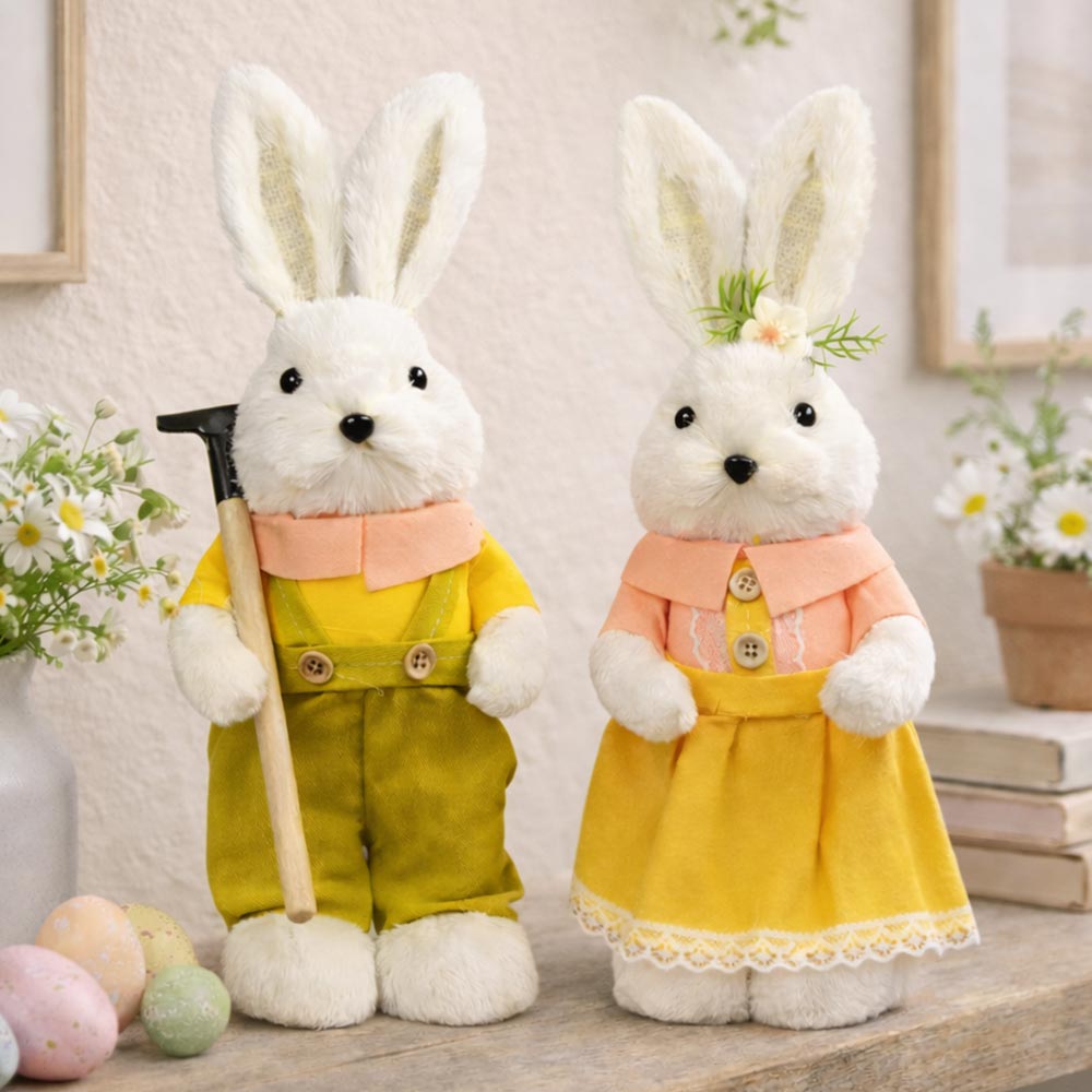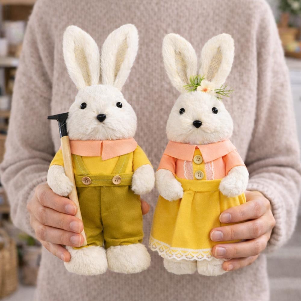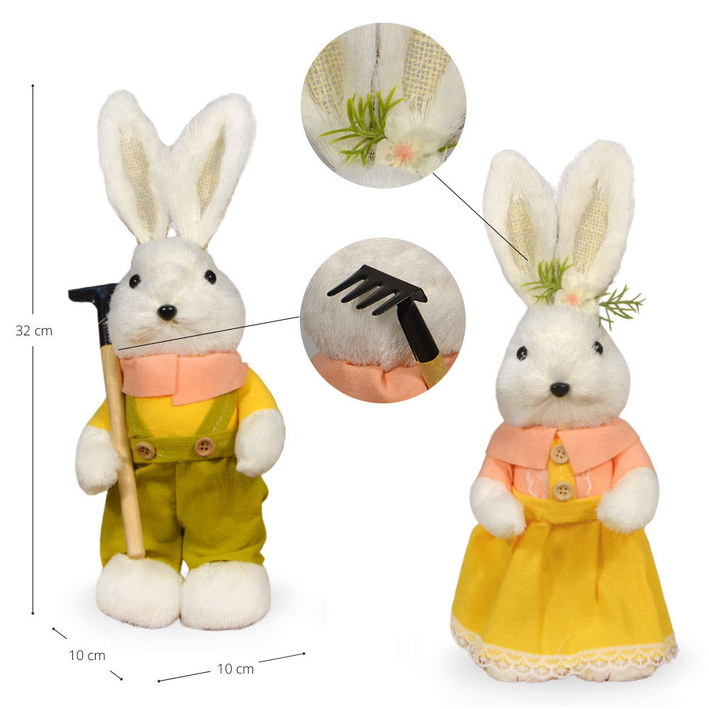 Realizzati con morbido rivestimento in pelo sintetico, presentano un curato vestitino giallo con dettagli decorativi, rastrello e fiorellino, che richiamano l’atmosfera pasquale e della primavera.