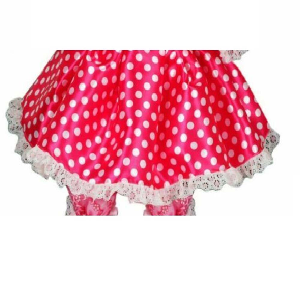 sfizioso cappellino di ciniglia rosa con fiocco di raso stampato a pois vestito in ciniglia con maniche a sbuffo con chiusura a zip sul di dietro. Il vestito si completa con dei pantaloncini in raso con pizzo e copriscarpe in coordinato