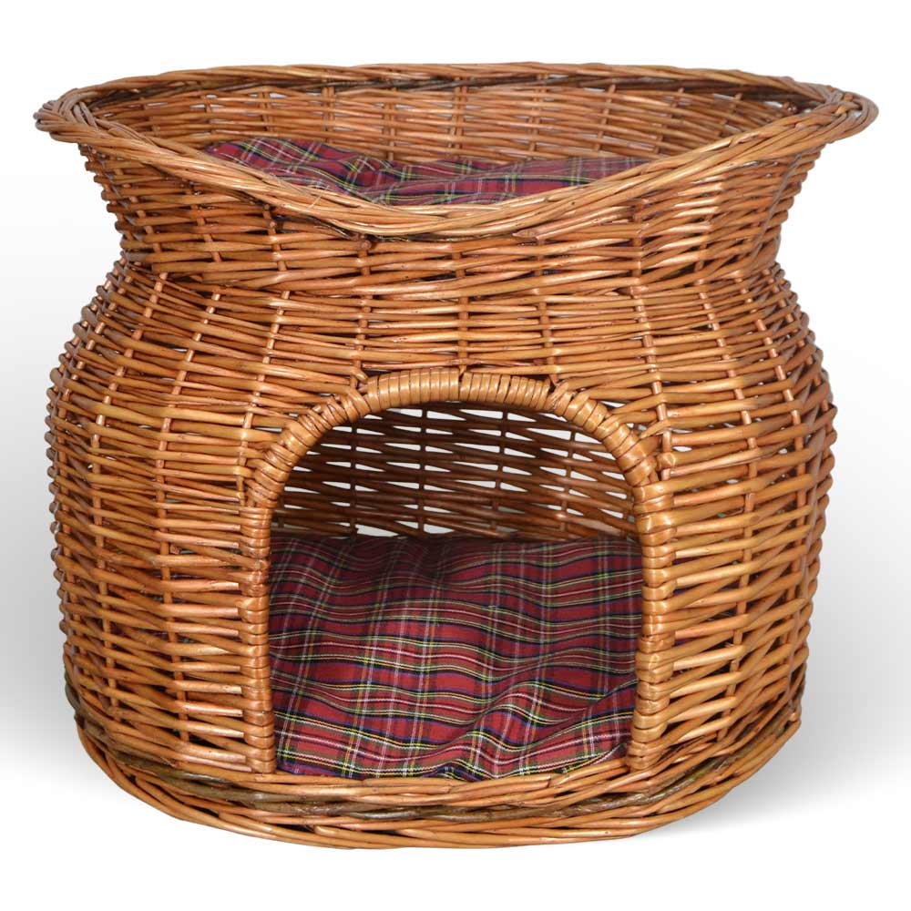 Cuccia a doppio piano in vimini naturale intrecciato a mano, ideale per animali di piccola o media taglia.