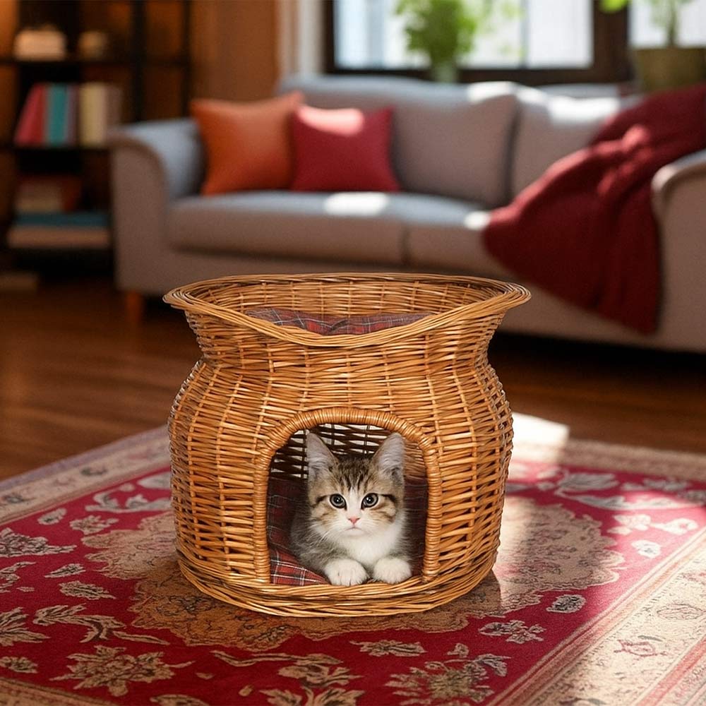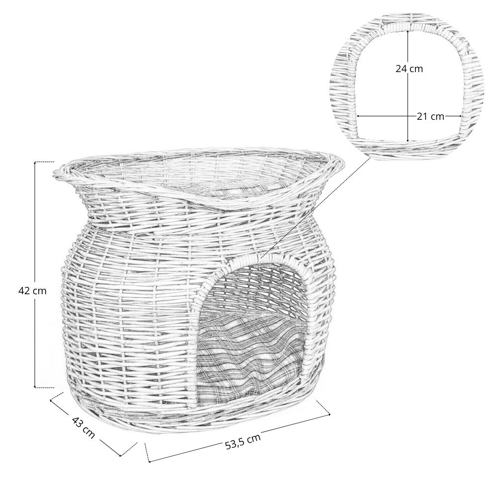 Questa cuccia per animali di taglia piccola o media è realizzata in vimini naturale intrecciato a mano, con una struttura solida a doppio piano.