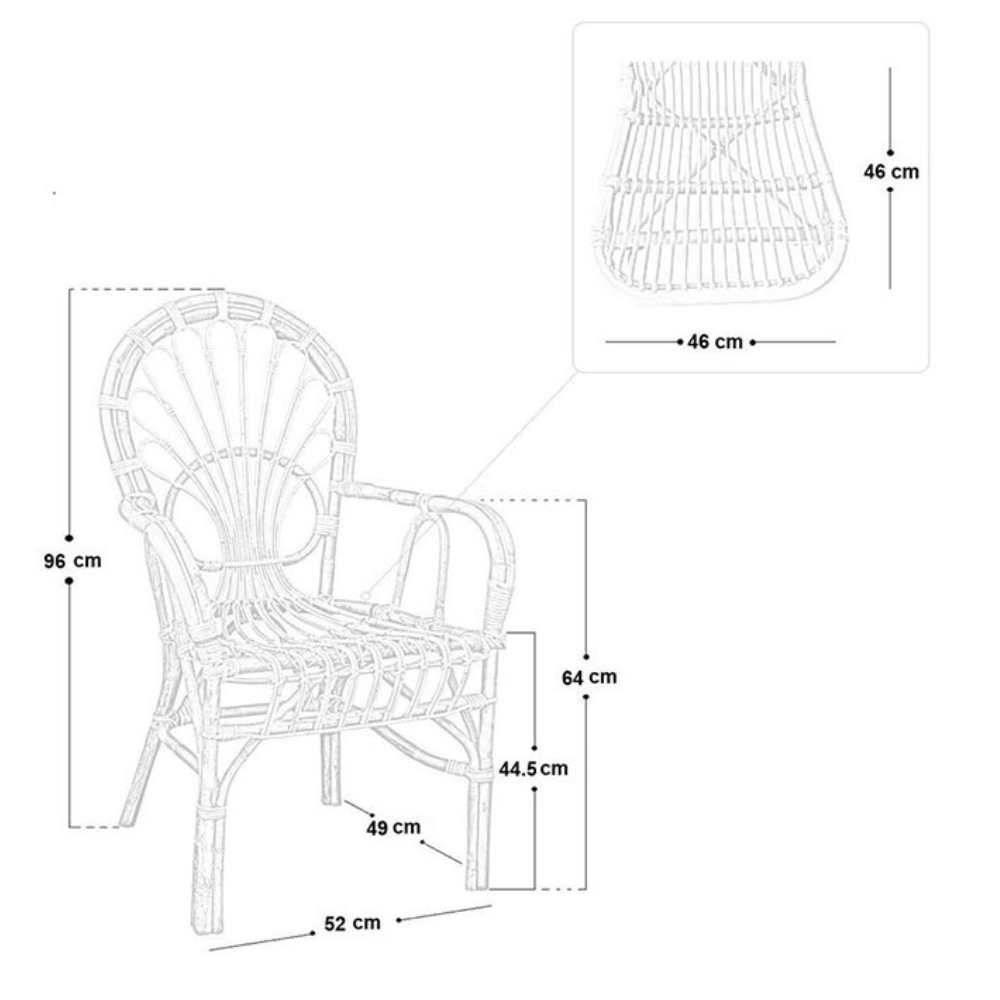 Dimensioni: altezza da terra alla seduta 44,5 cm, altezza totale (fino alla sommità dello schienale) 96 cm.