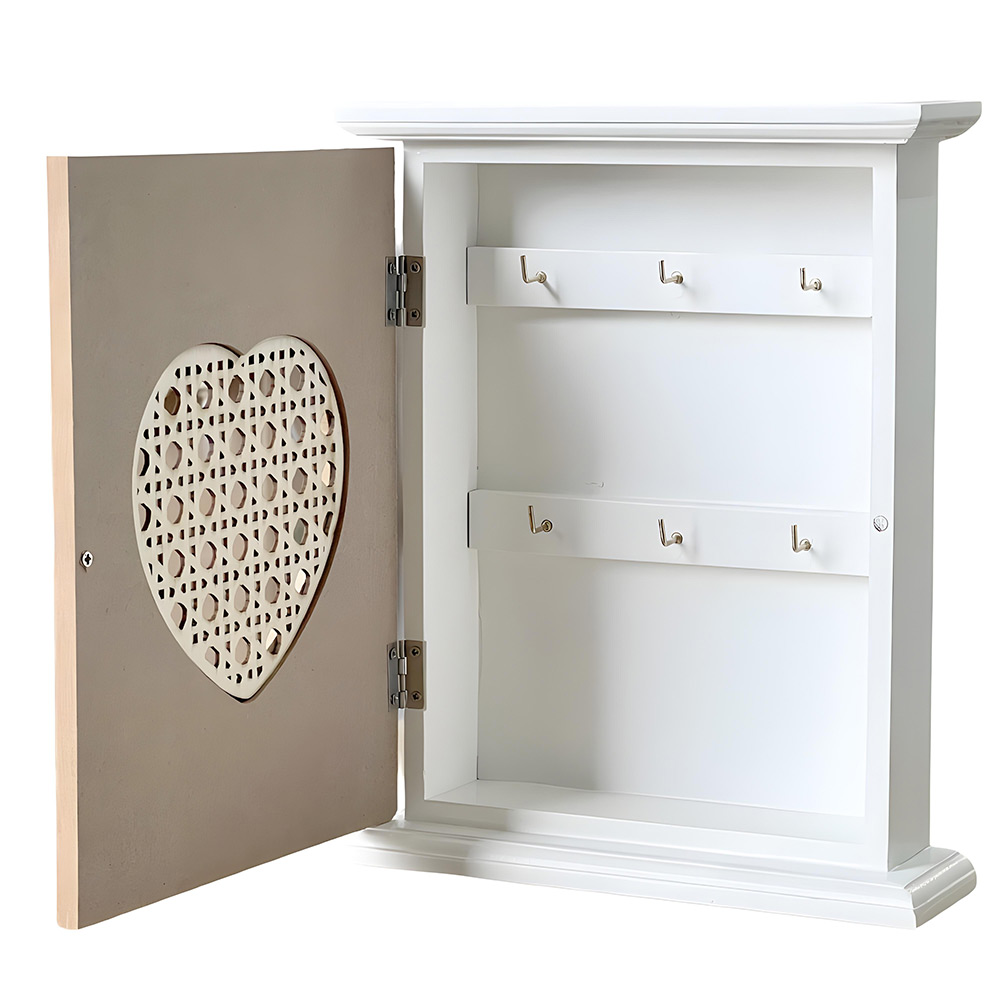 Realizzato in legno bianco, è decorato con un grande cuore traforato intarsiato e una delicata scritta HOME, per un tocco elegante e romantico.