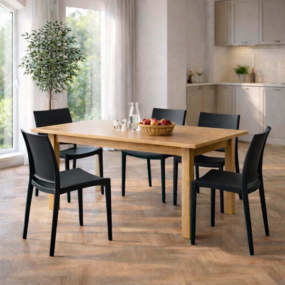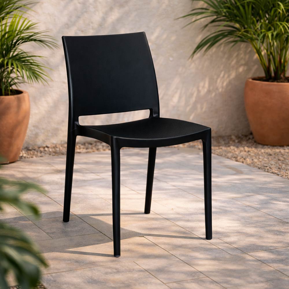 La sedia Altea è un modello unico monoblocco in plastica di colore nero, impilabile, dal design moderno e funzionale.