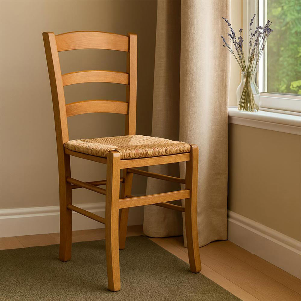 Questa sedia paesana è interamente realizzata in legno di faggio italiano con una finitura noce chiaro e una seduta tradizionale in paglia di riso, intrecciata a mano.