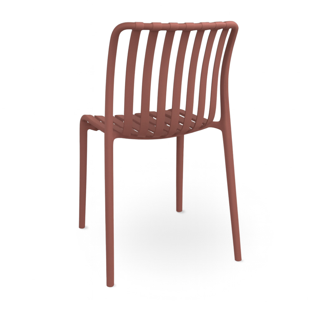 La sedia Iside è realizzata in un unico monoblocco in plastica rosso mattone, dal design moderno, leggero e originale.
