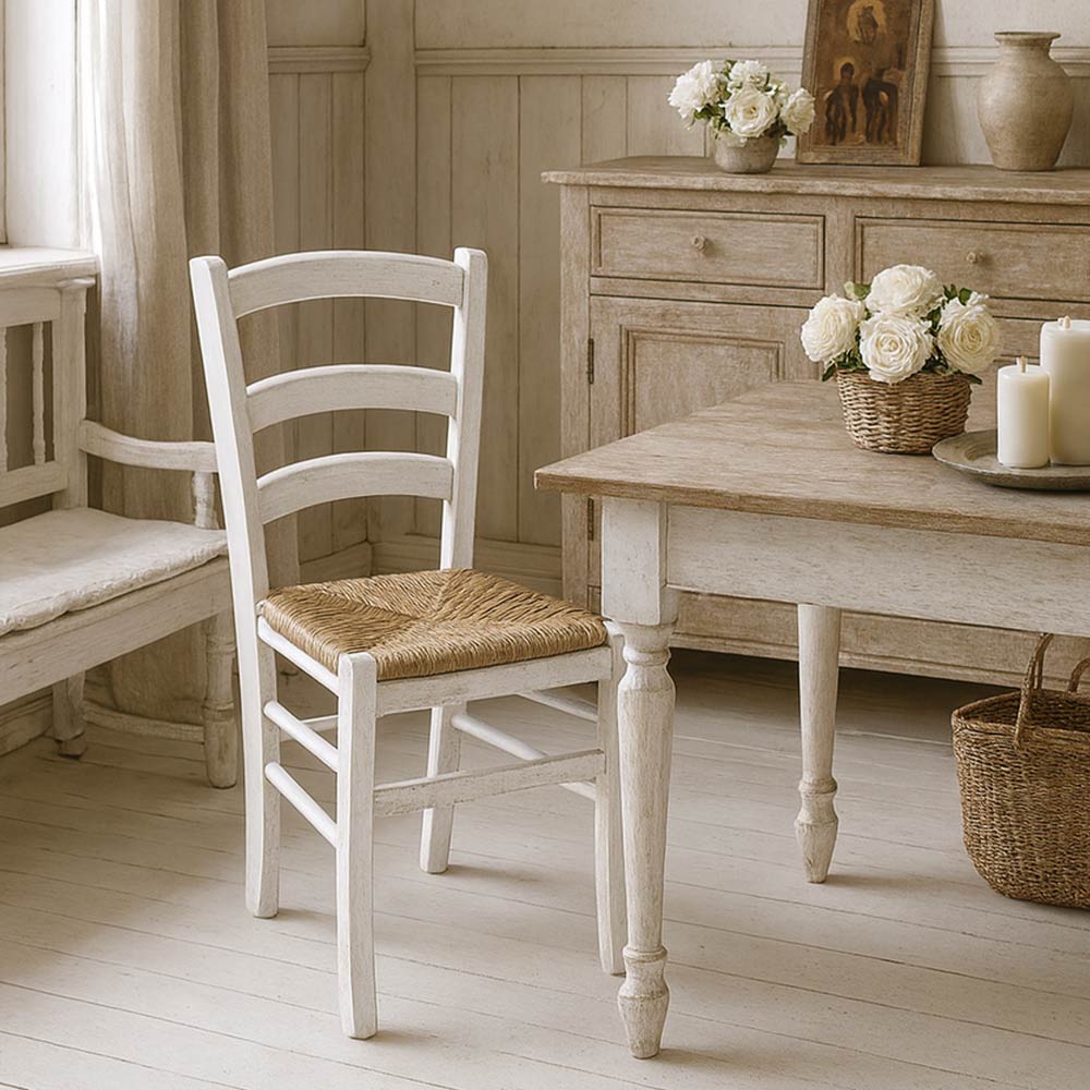 La Sedia Venezia è realizzata interamente in legno massello di faggio, lavorata a mano da maestri artigiani italiani per ottenere un elegante effetto anticato shabby chic.