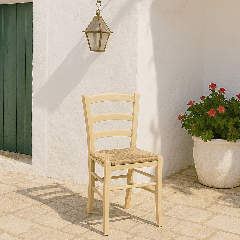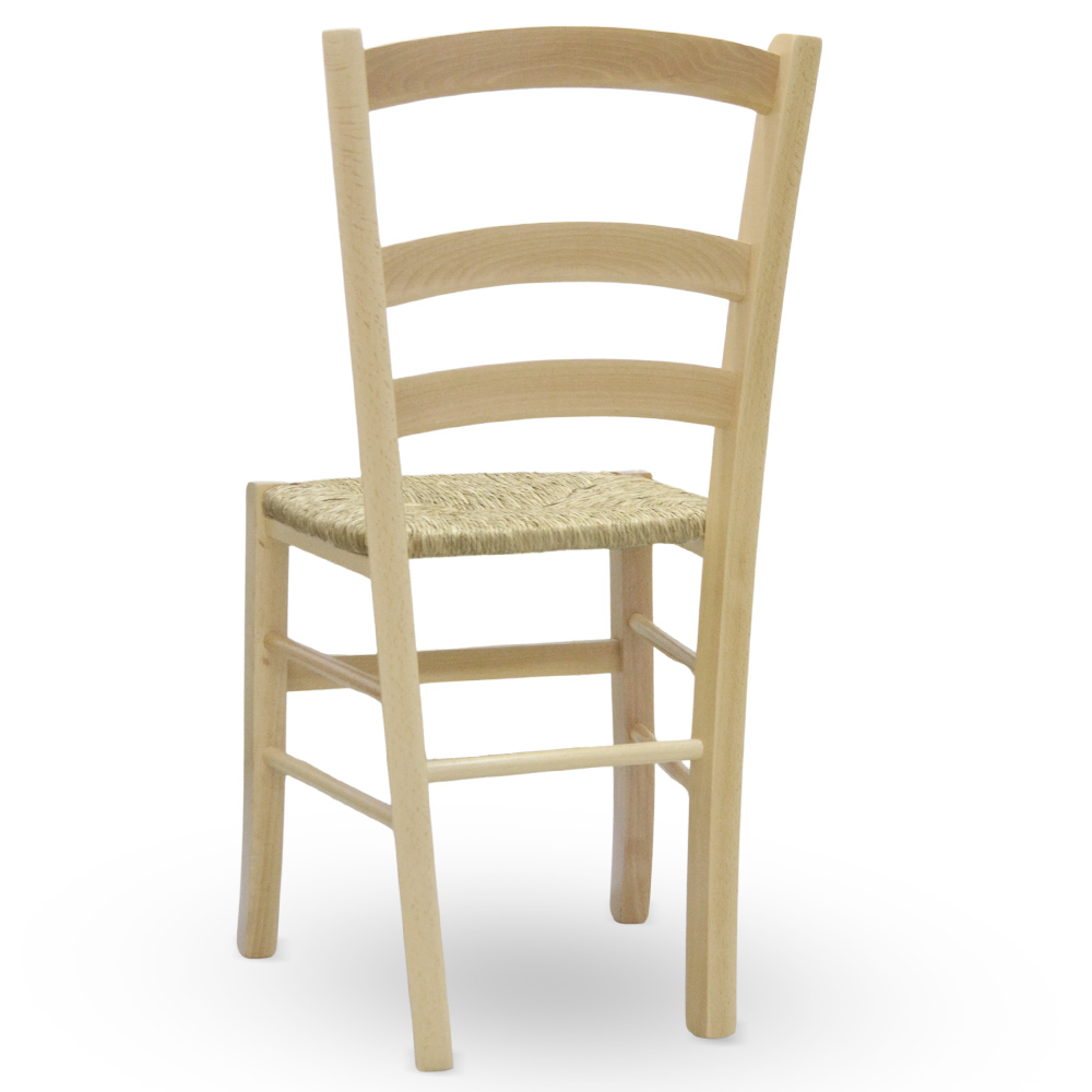 Materiali di qualità: sedia Venezia realizzata interamente in legno massello di faggio con finitura naturale e seduta in paglia palustre facilmente sostituibile grazie al fissaggio con viti.