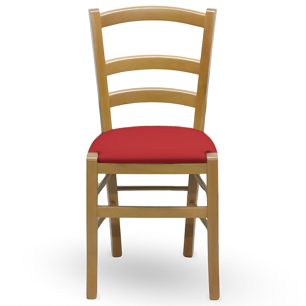 Sedia Venezia interamente realizzata in legno massiccio in tinta color noce chiaro con seduta similpelle rosso,