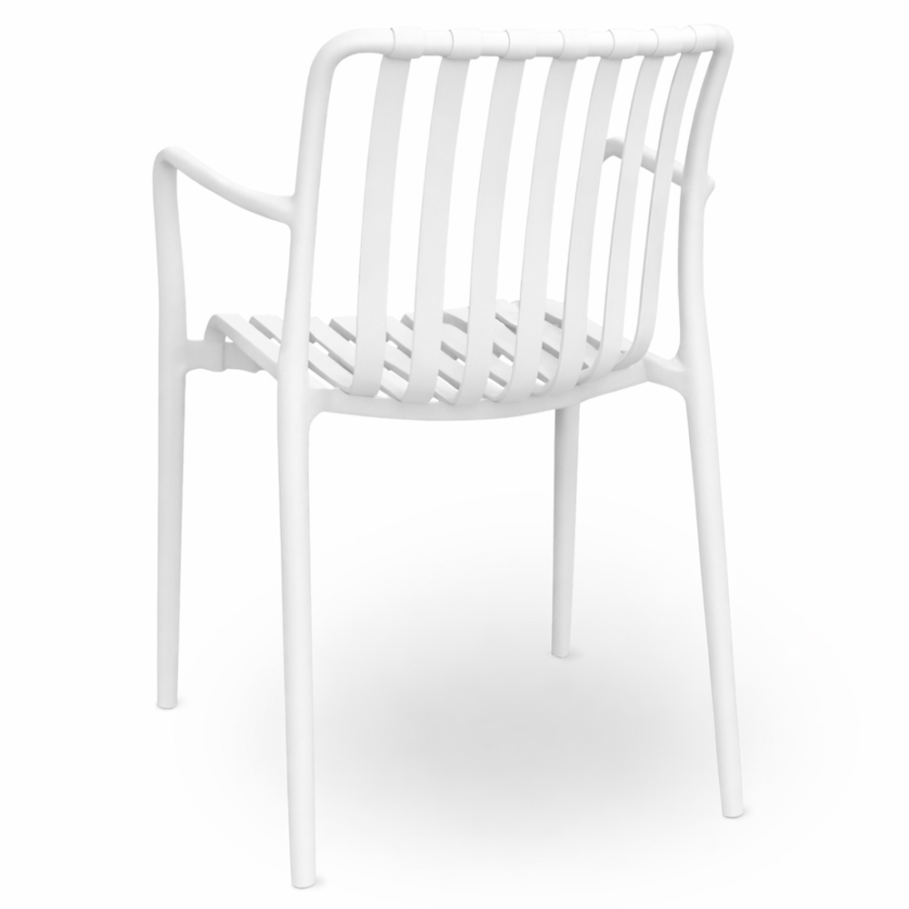 La sedia Iside è realizzata in un unico monoblocco in plastica bianca, con braccioli, dal design moderno, leggero e originale.