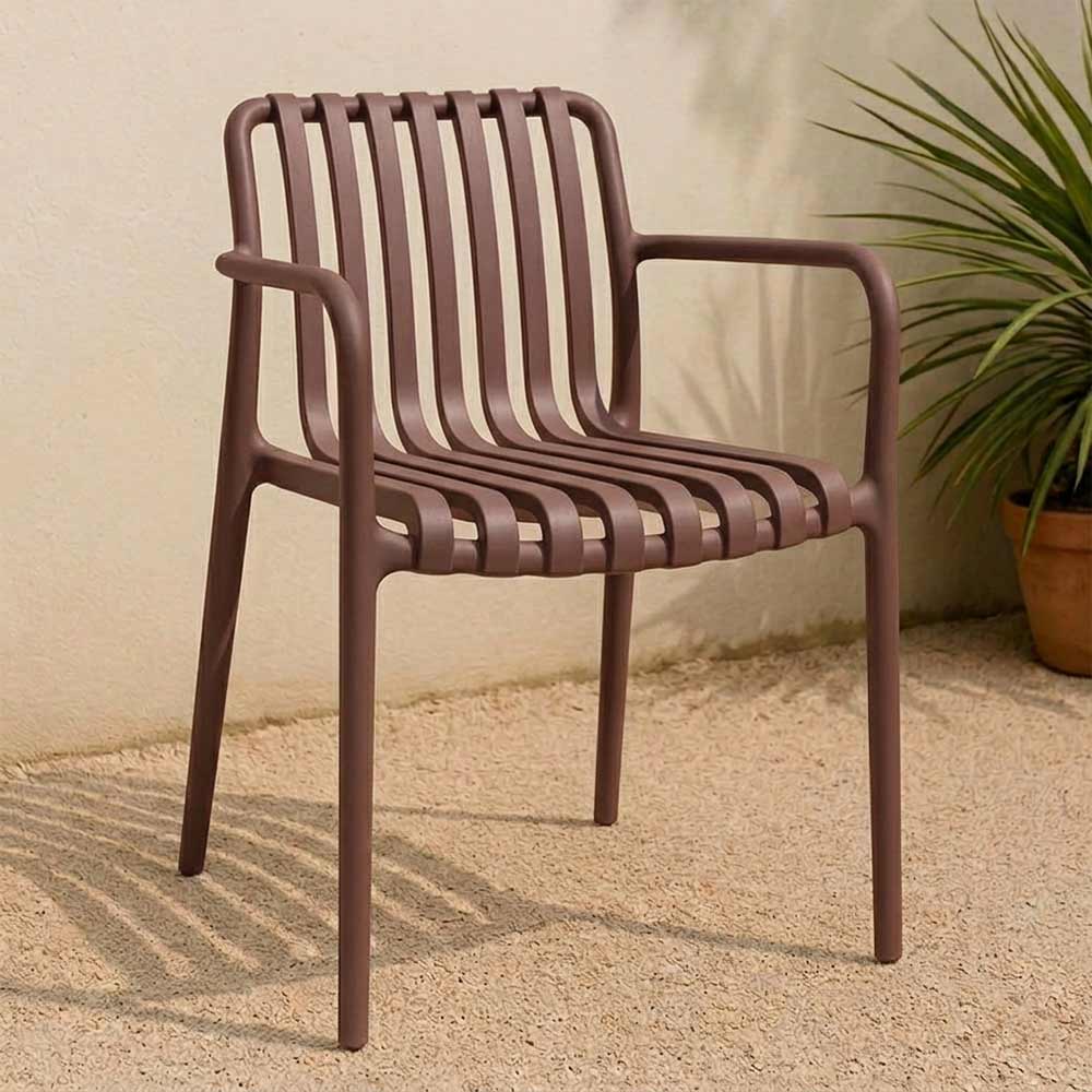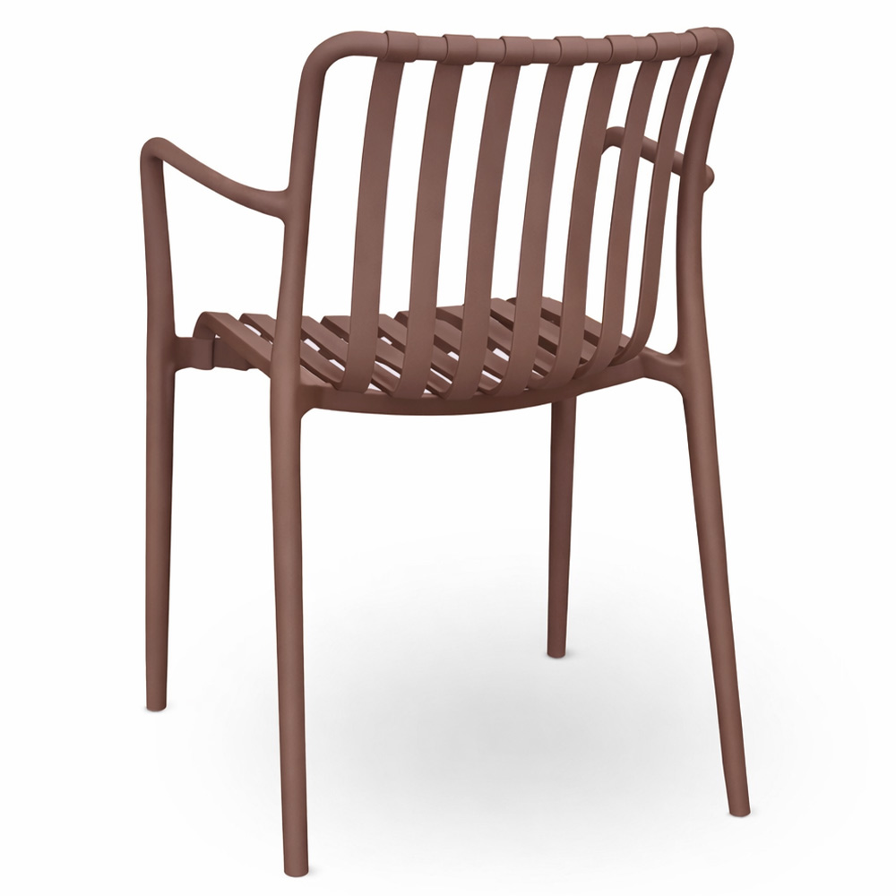 La sedia Iside è realizzata in un unico monoblocco in plastica marrone, con braccioli, dal design moderno, leggero e originale.