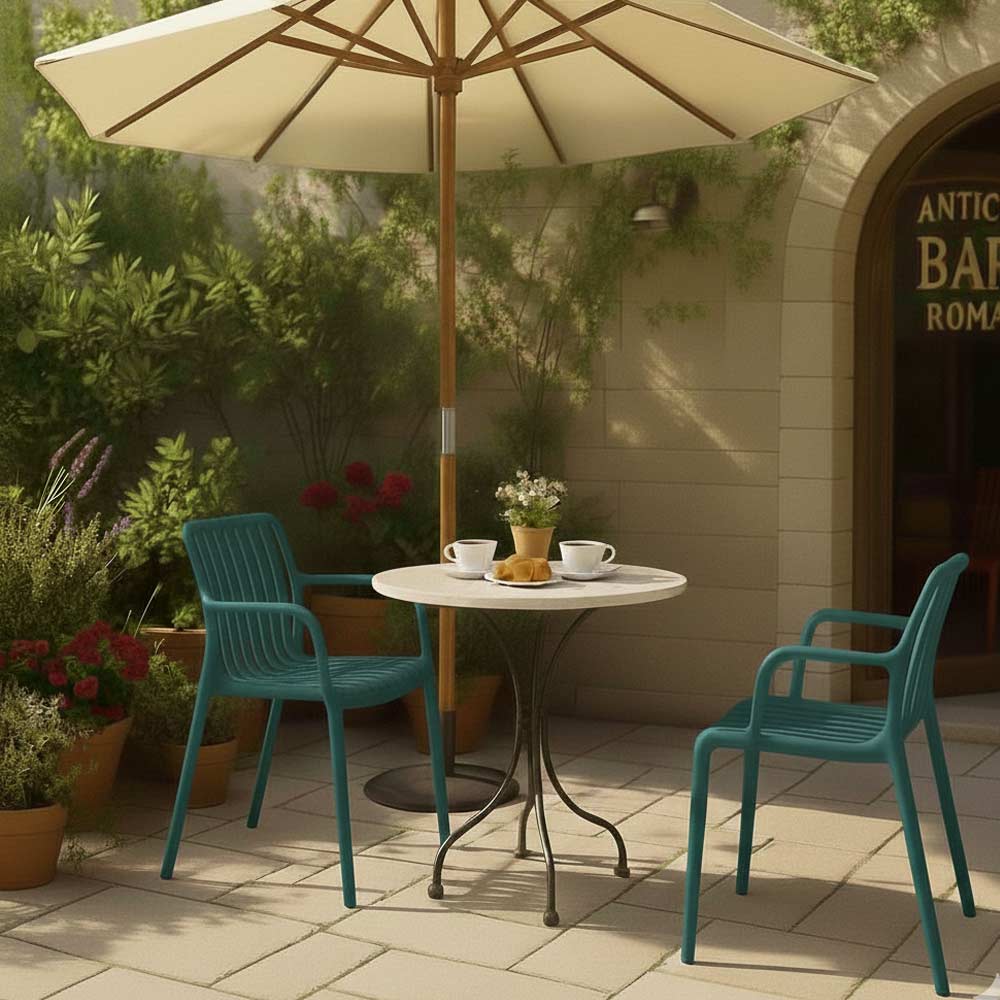 Impilabile e pratica, rappresenta una soluzione ideale per arredare ambienti esterni come giardini, terrazzi e dehors, ma si adatta perfettamente anche ad ambienti interni come casa, bar e locali.