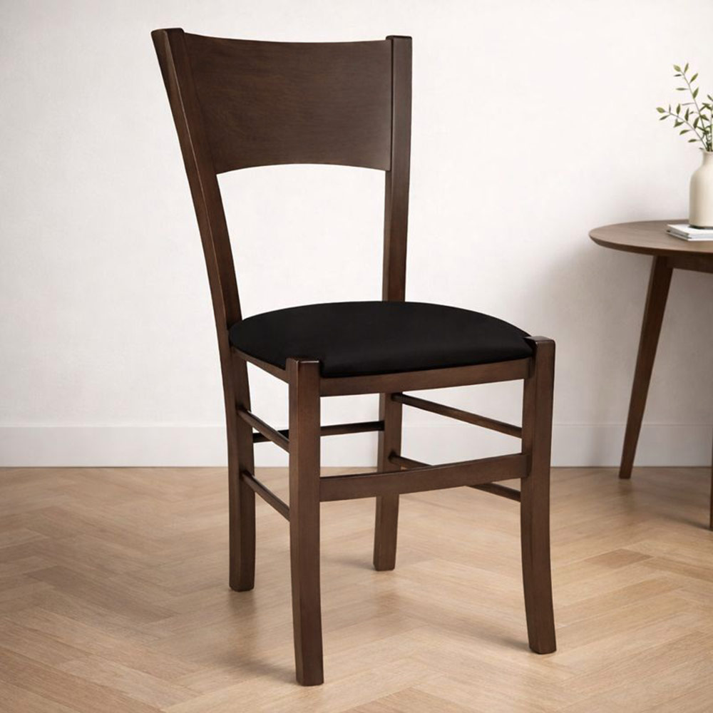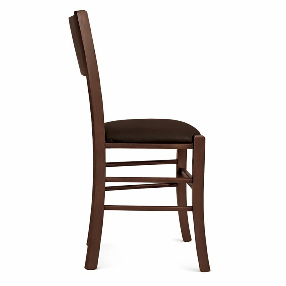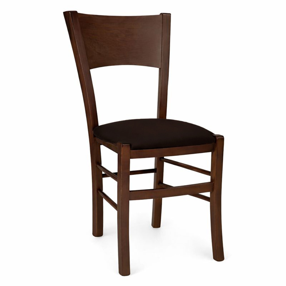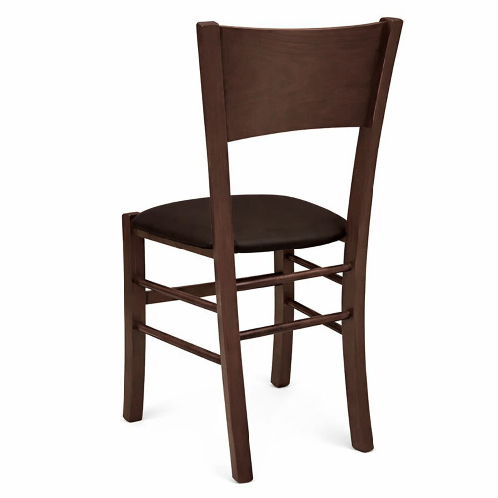 La sedia Lucy è interamente realizzata in legno, con una struttura robusta in faggio italiano e una seduta imbottita rivestita in ecopelle marrone, perfetta per chi cerca comfort e stile in un'unica soluzione.