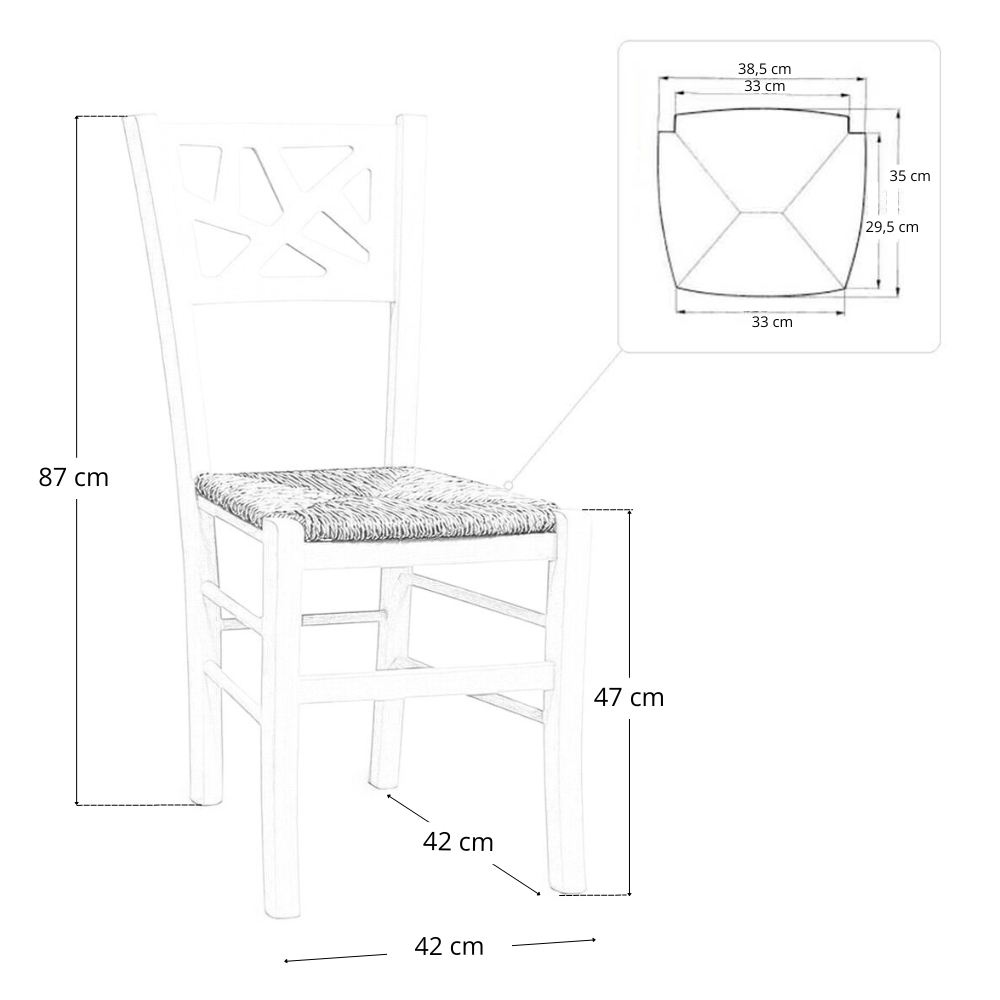 Le sue dimensioni sono: altezza totale fino alla spalliera 87 cm, altezza da terra alla seduta 47 cm.