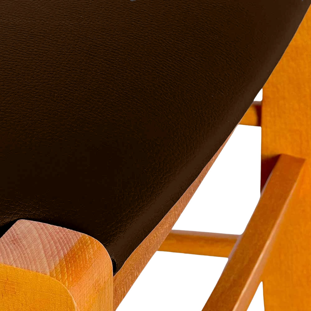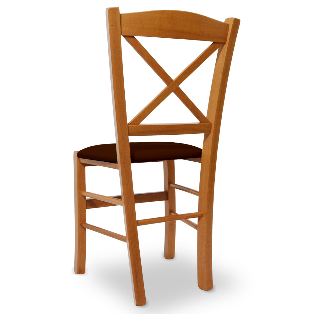 Sedia modello Venezia costruita in robusto legno massello di faggio, finitura ciliegio, con schienale a croce e con seduta in similpelle marrone