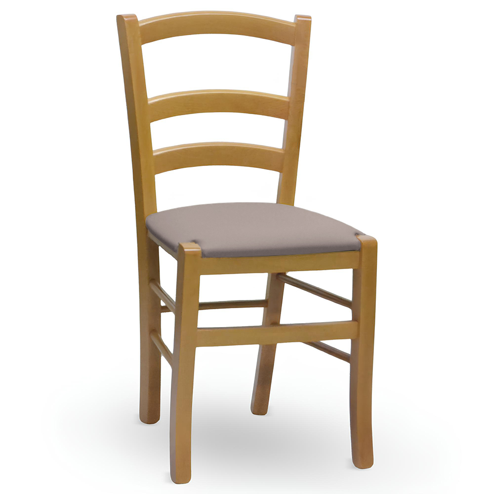 La sedia Venezia è realizzata interamente in legno massiccio di faggio con finitura noce chiaro.