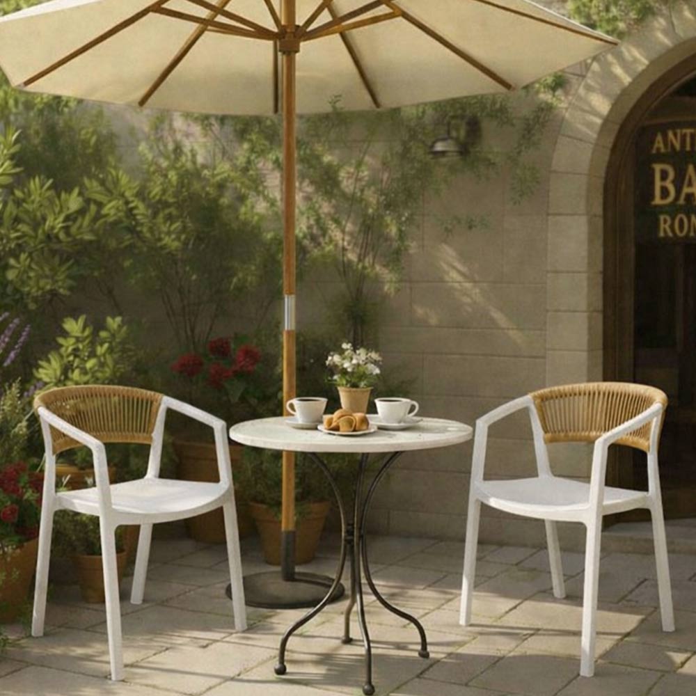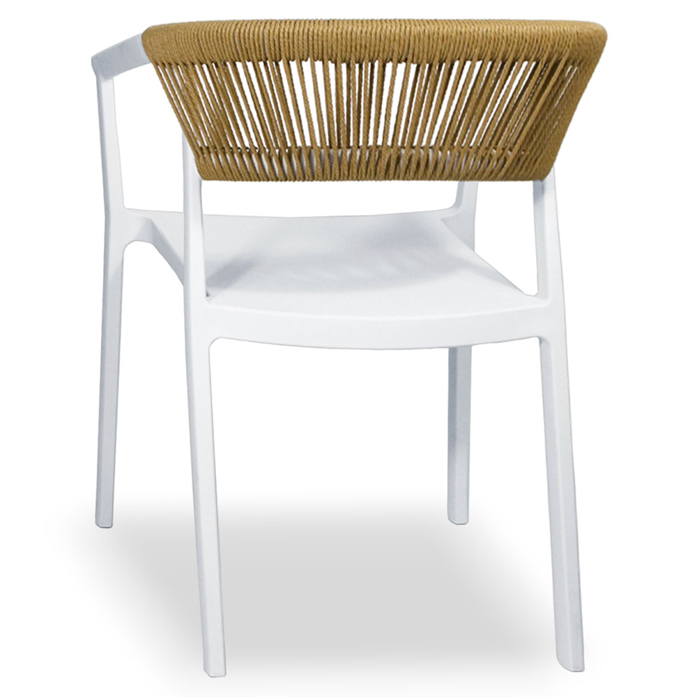 La sedia da Bar Sety è una poltroncina elegante e funzionale, realizzata in polipropilene bianco con schienale curvo in corda intrecciata beige, dal design moderno e raffinato.