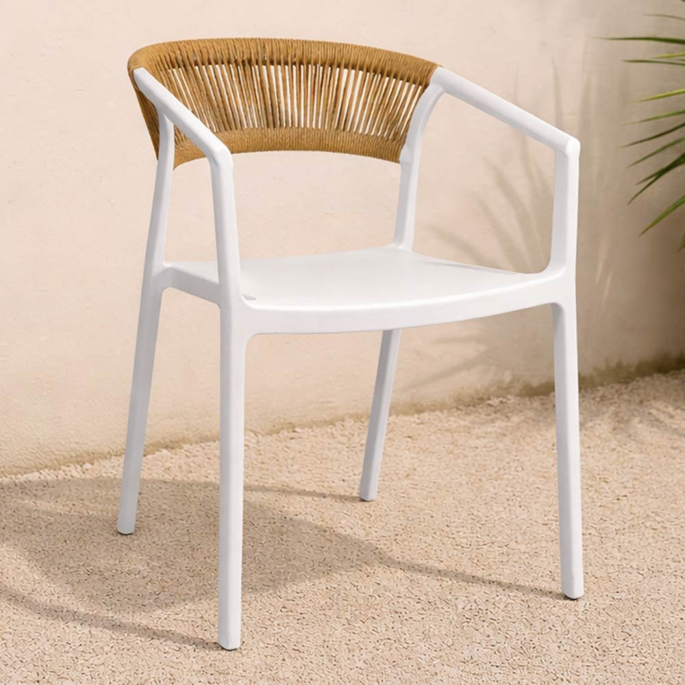 Versatile e resistente, unisce stile e praticità grazie alla struttura solida in polipropilene e allo schienale in corda intrecciata che garantisce comfort e supporto. I braccioli dalle linee morbide completano il design, offrendo una seduta accogliente e contemporanea.