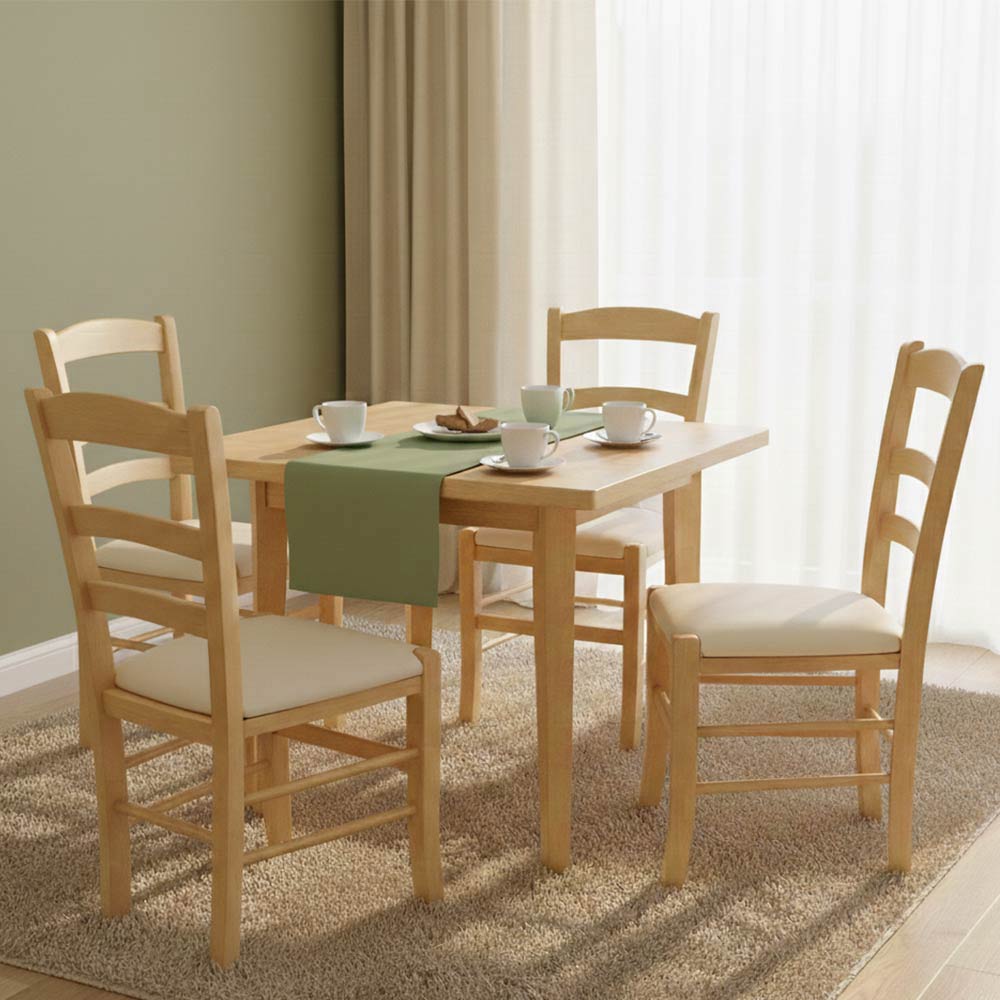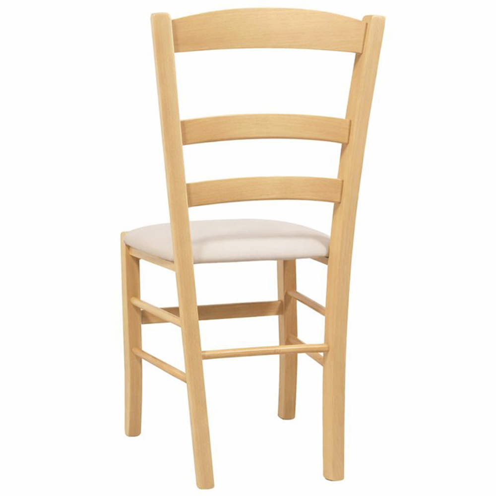 Questa sedia Paesana è interamente realizzata in legno con una finitura in legno naturale e una seduta imbottita rivestita in similpelle beige, comoda e resistente.