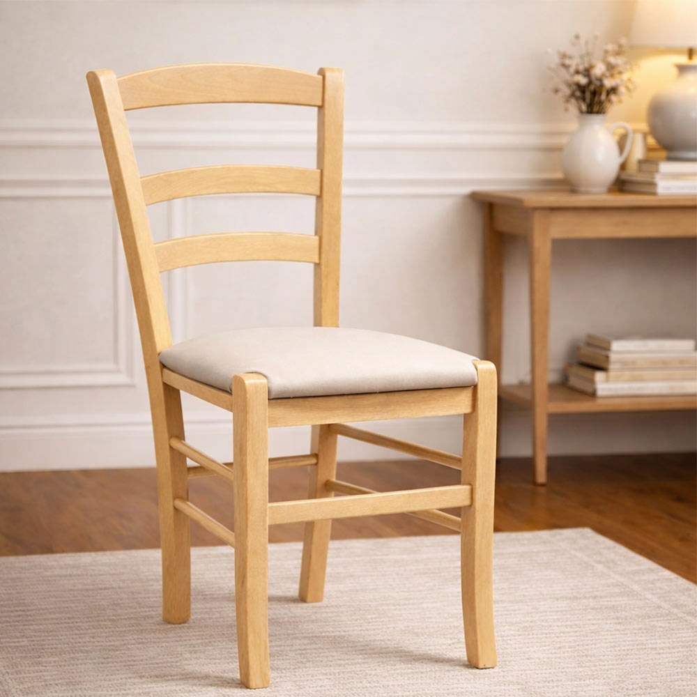Sedia color legno naturale con struttura robusta in legno e seduta imbottita beige