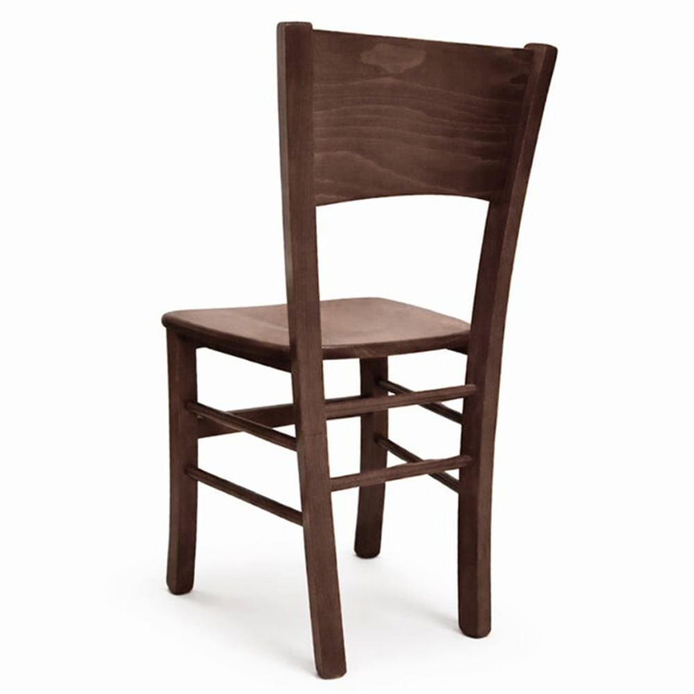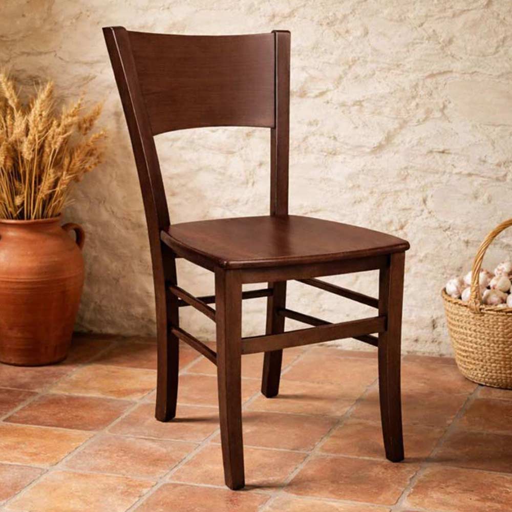 La Sedia Lucy in noce scuro presenta una seduta in legno massello dal fascino tradizionale.