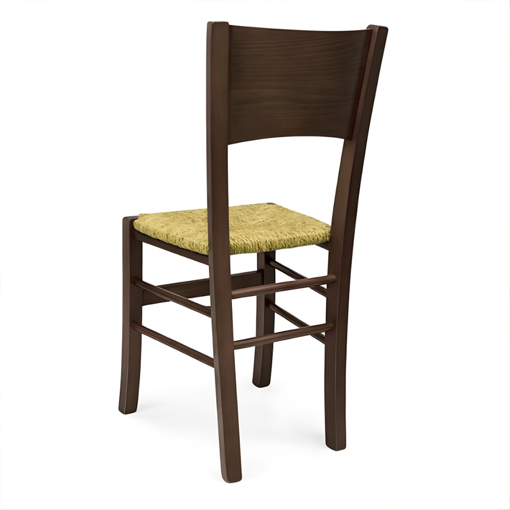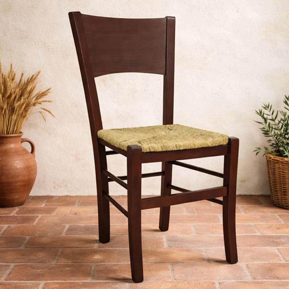 La Sedia Lucy in noce scuro presenta una seduta in paglia grezza dal fascino tradizionale.