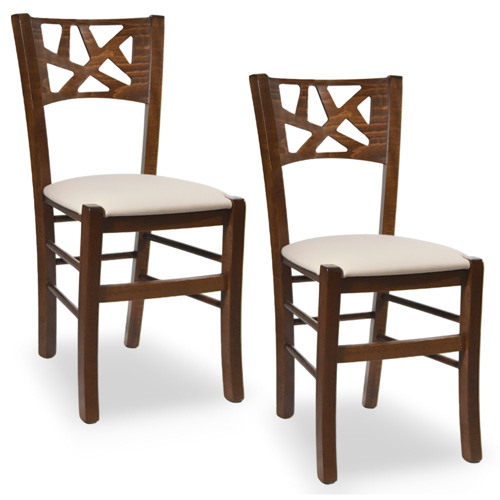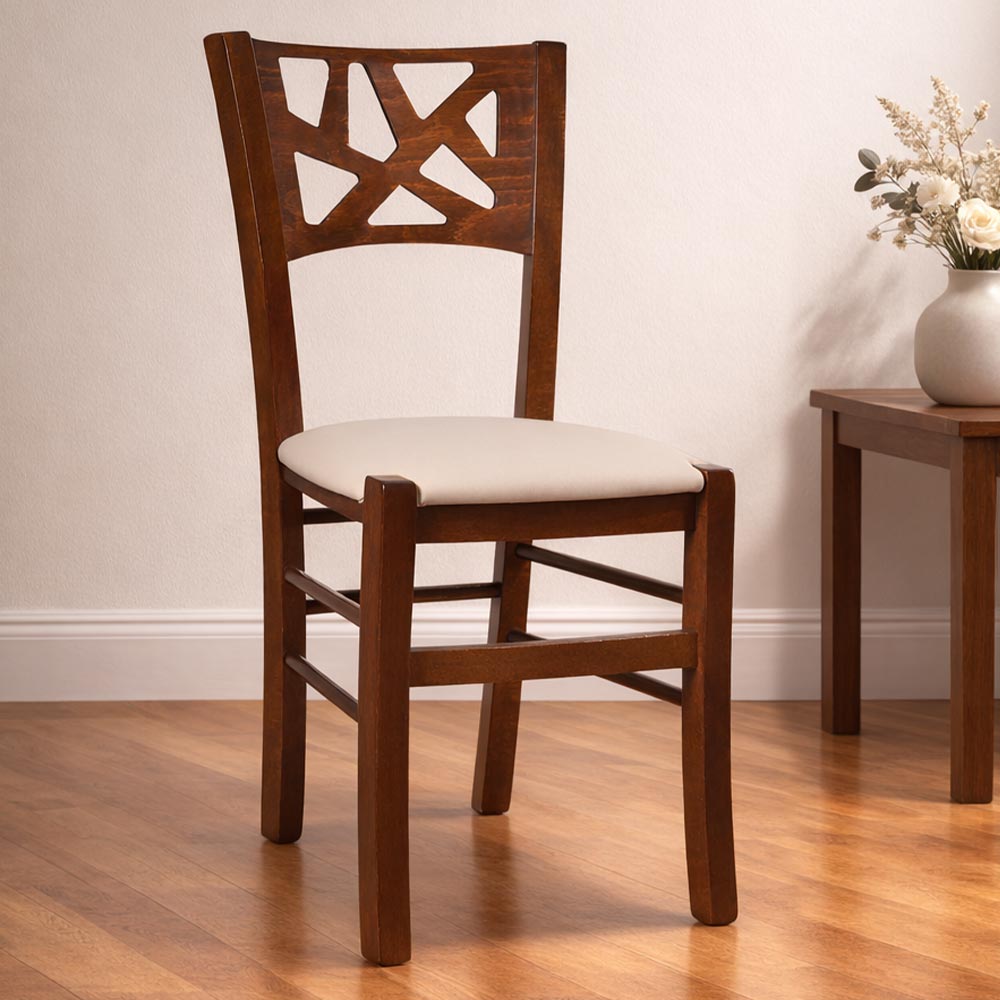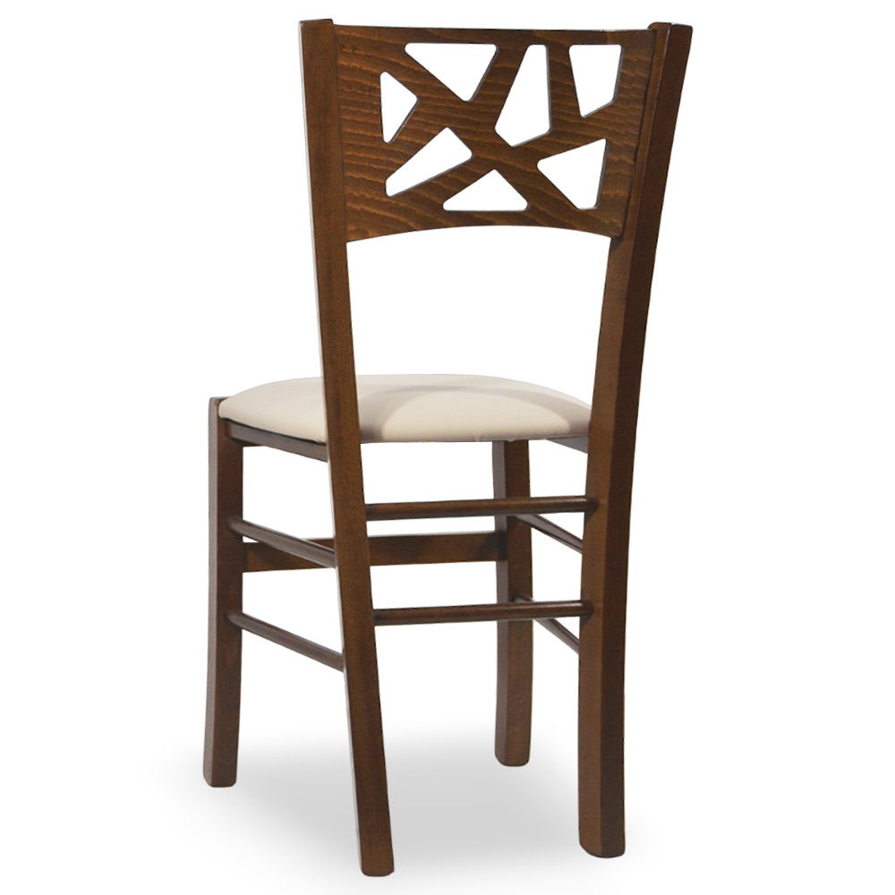 La sedia Sissy è interamente realizzata in legno, con una struttura robusta in faggio italiano e una seduta imbottita rivestita in similpelle beige, perfetta per chi cerca comfort e stile in un'unica soluzione.