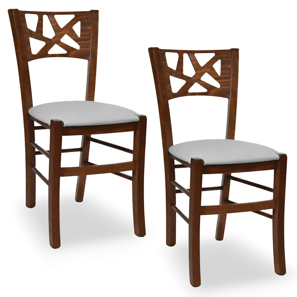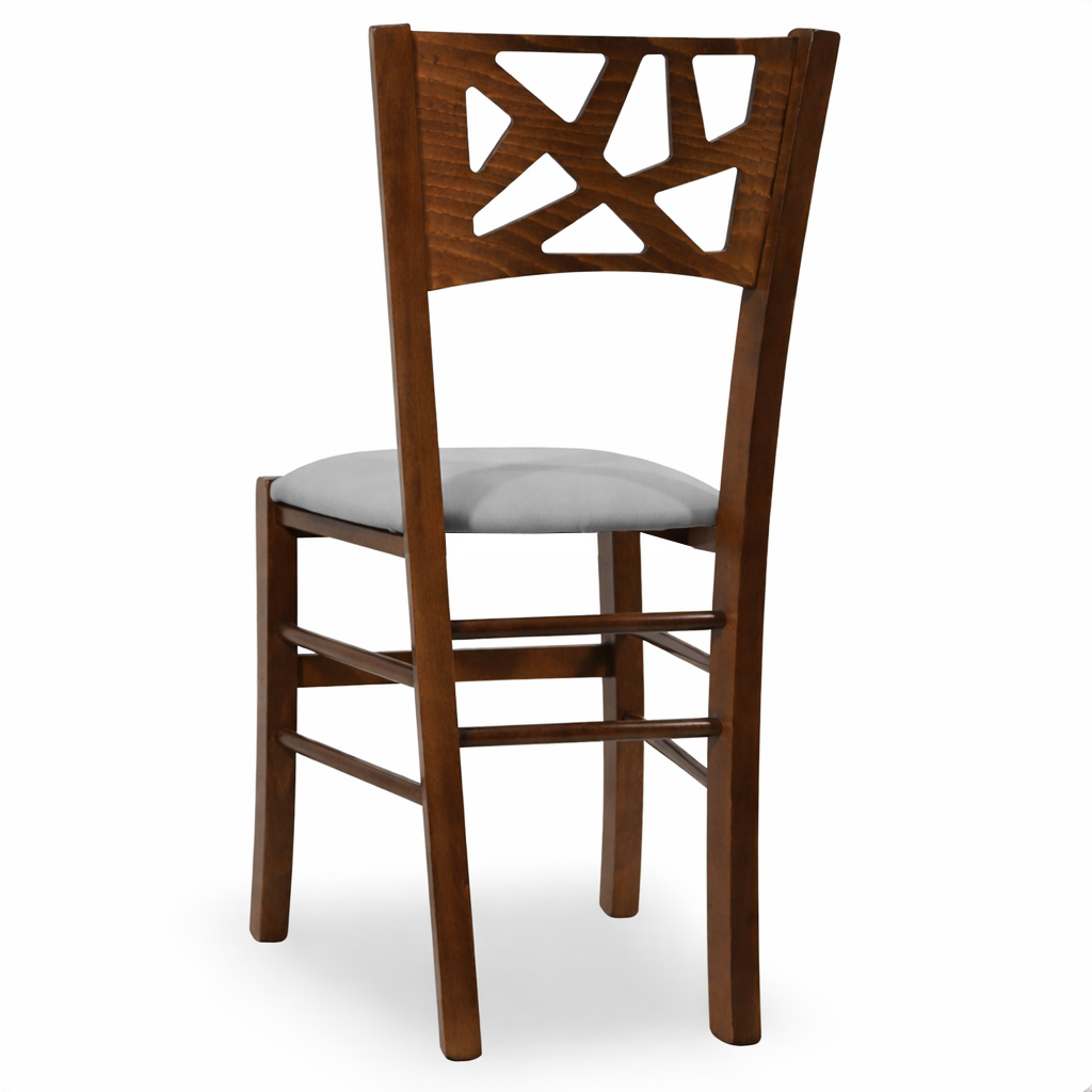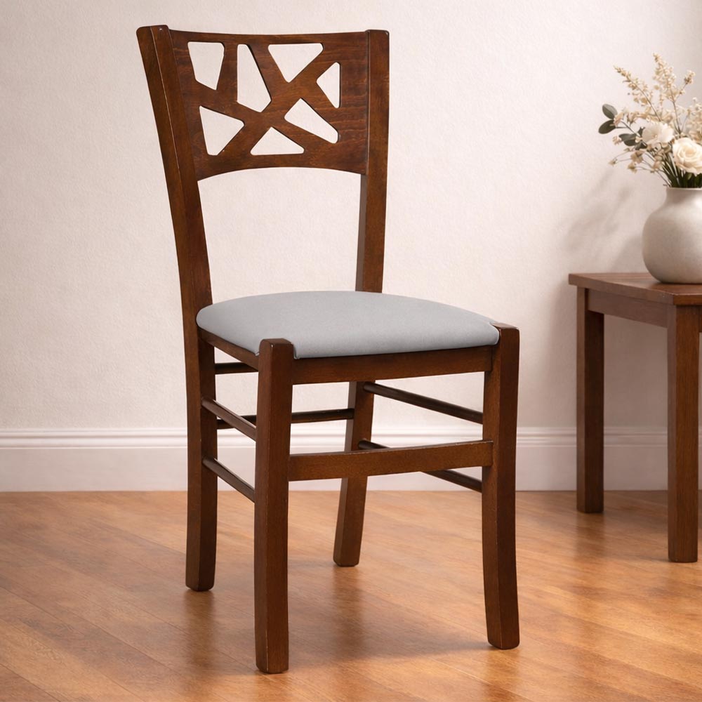 La sedia Sissy è interamente realizzata in legno, con una struttura robusta in faggio italiano e una seduta imbottita rivestita in similpelle grigio chiaro, perfetta per chi cerca comfort e stile in un'unica soluzione.
