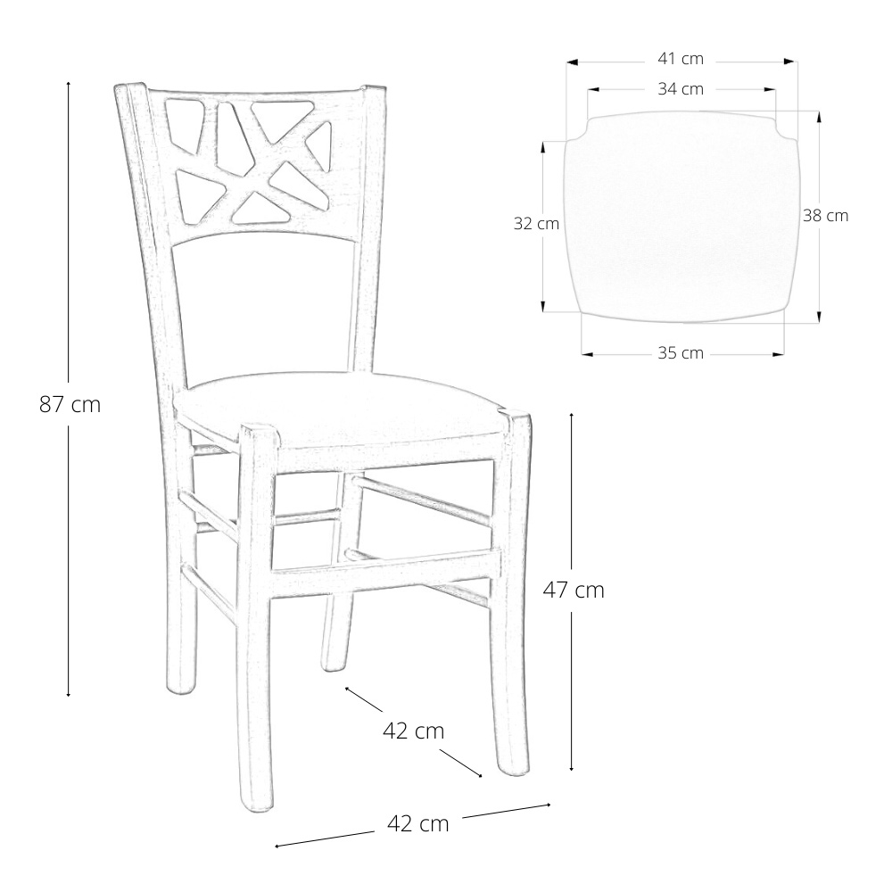 Le sue dimensioni sono: altezza totale fino alla spalliera 87 cm, altezza da terra alla seduta 47 cm.