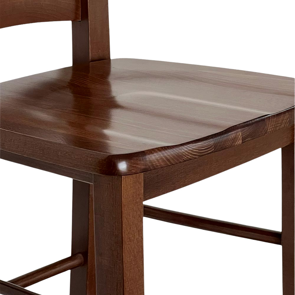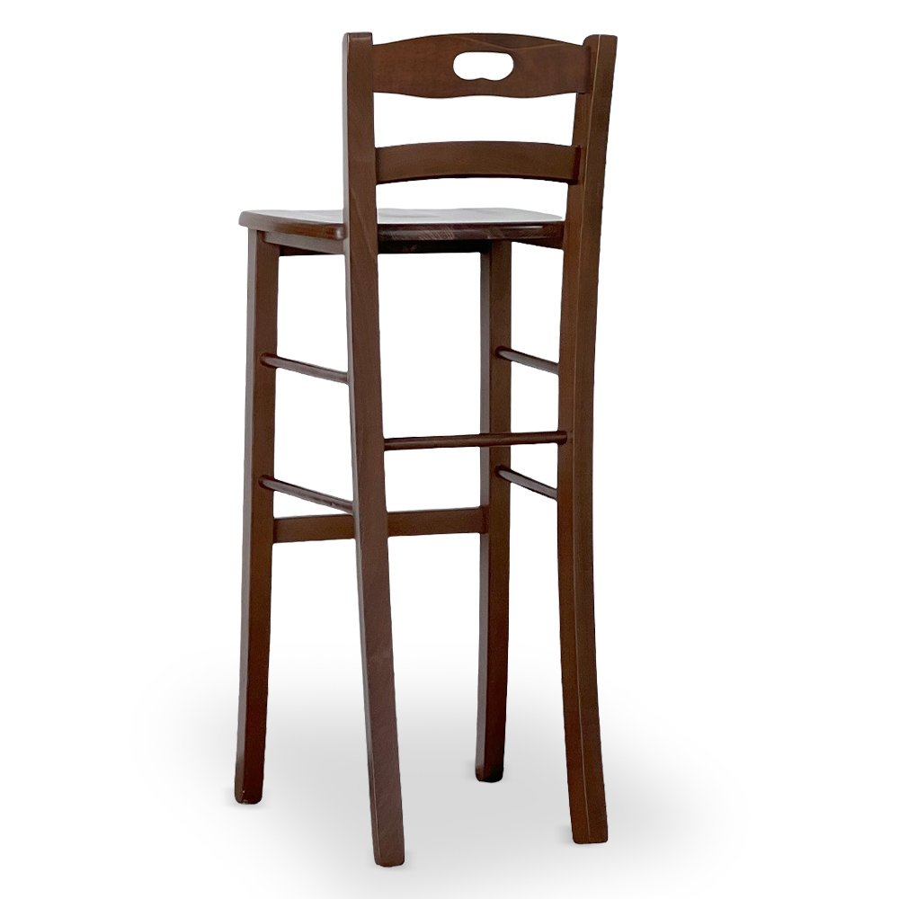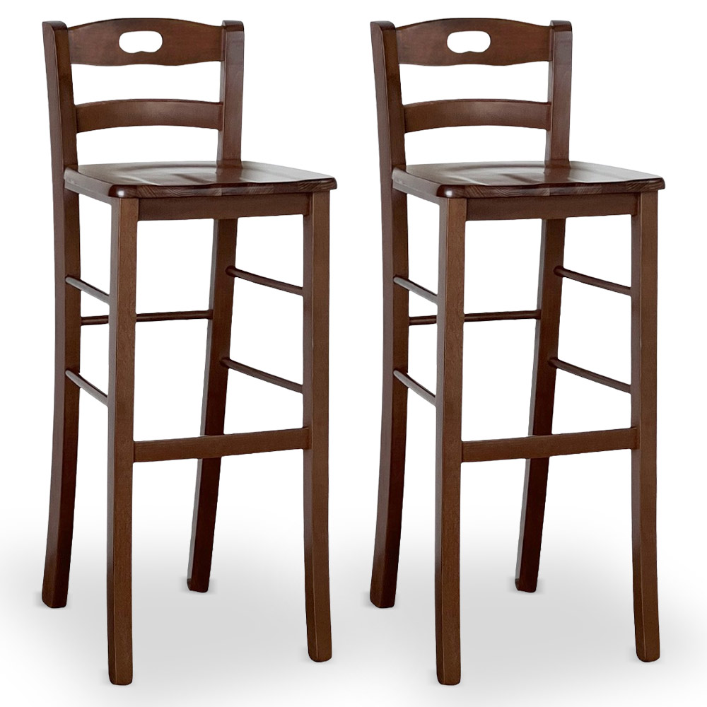Coppia di sgabelli interamente realizzati in legno di faggio italiano, con foro nello schienale, seduta in legno massello e finitura noce scuro.