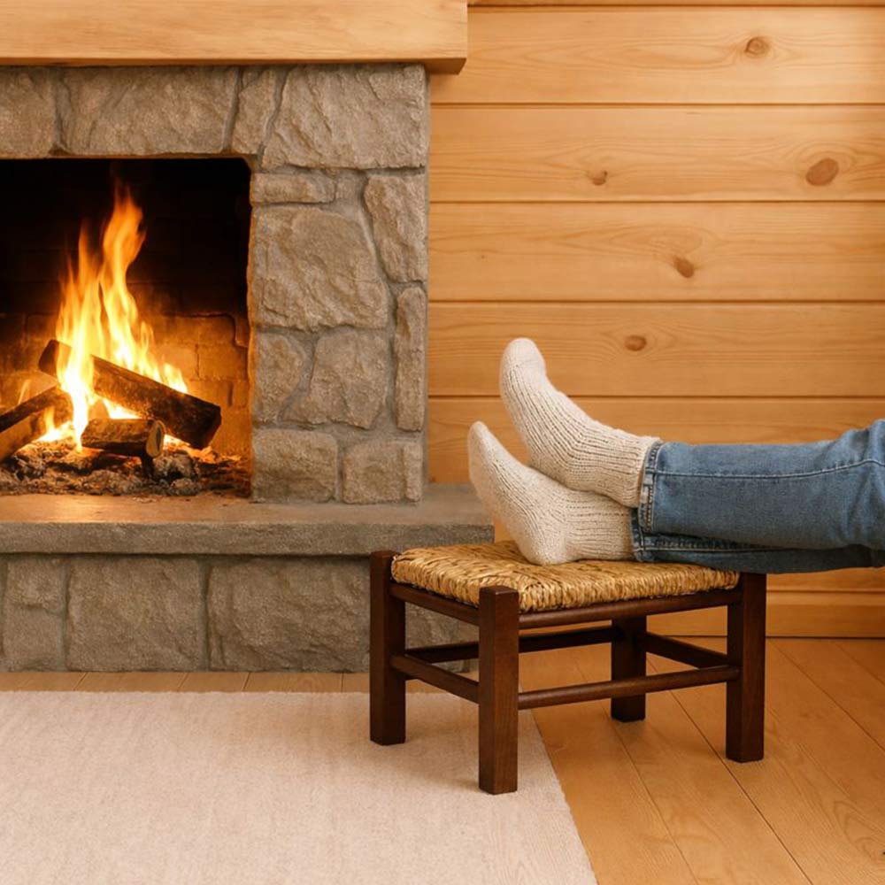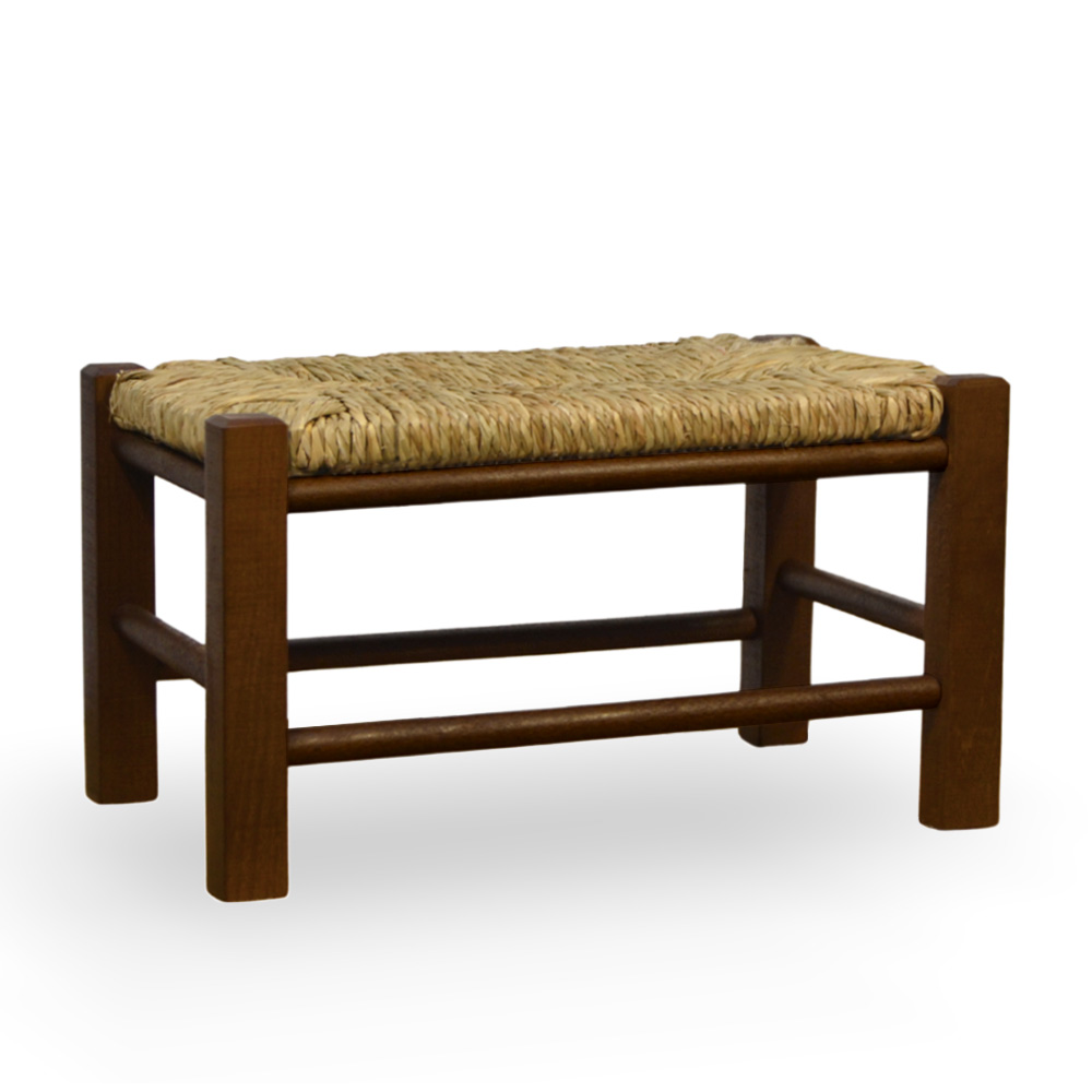 di poggiapiedi realizzati in legno di faggio con finitura noce scuro e base in paglia, robusti e stabili.