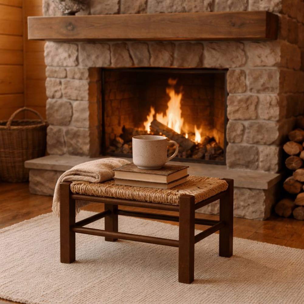 Materiali e finiture: realizzati in legno di faggio con finitura noce scuro e base in paglia, pensati per garantire stabilità e resistenza nel tempo.